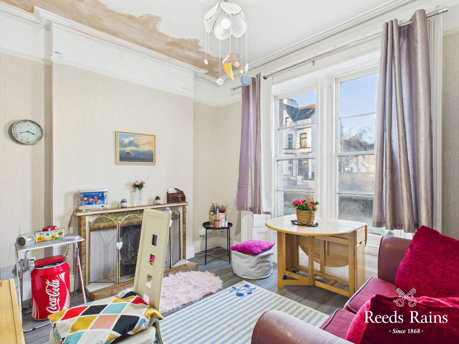 Tiled fireplace and hearth incorporating an open fire. Ceiling coving and centre rose.