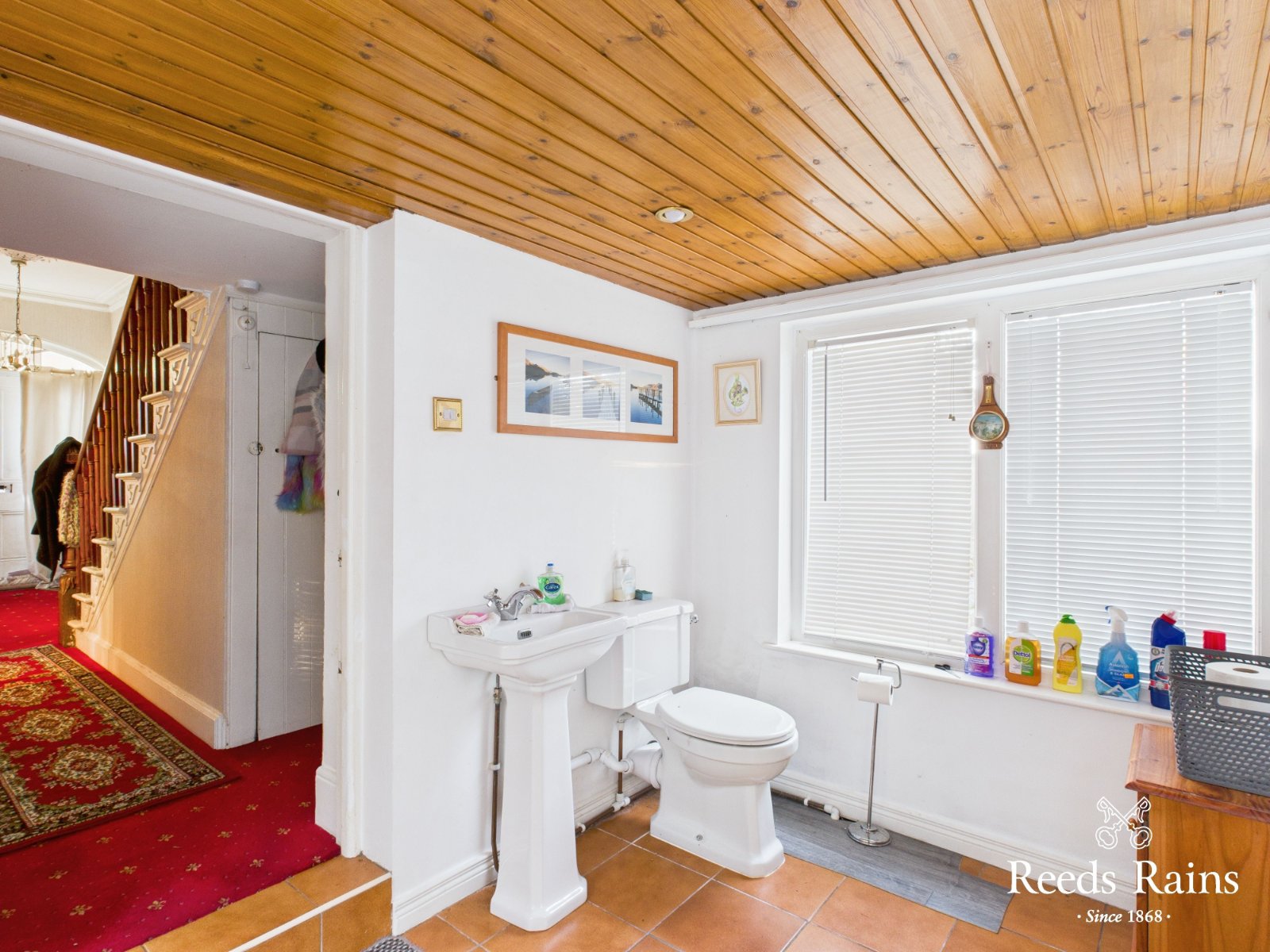 WC and wash hand basin. Tiled floor. Pine strip ceiling. Spotlights.