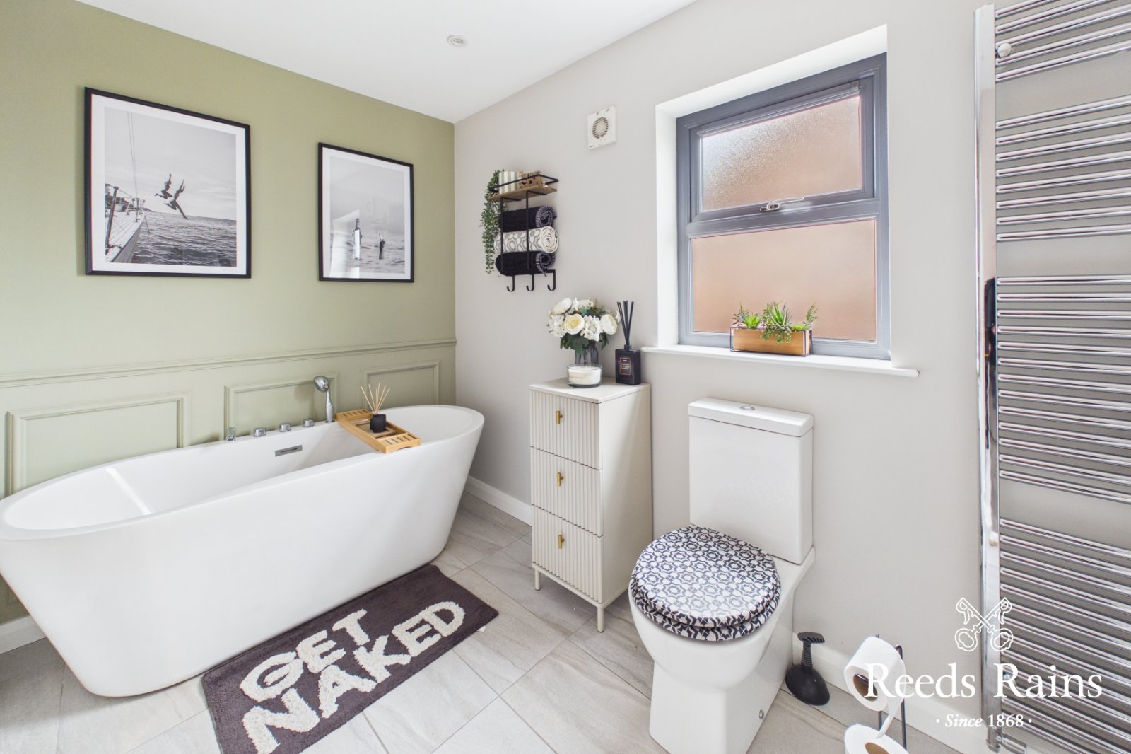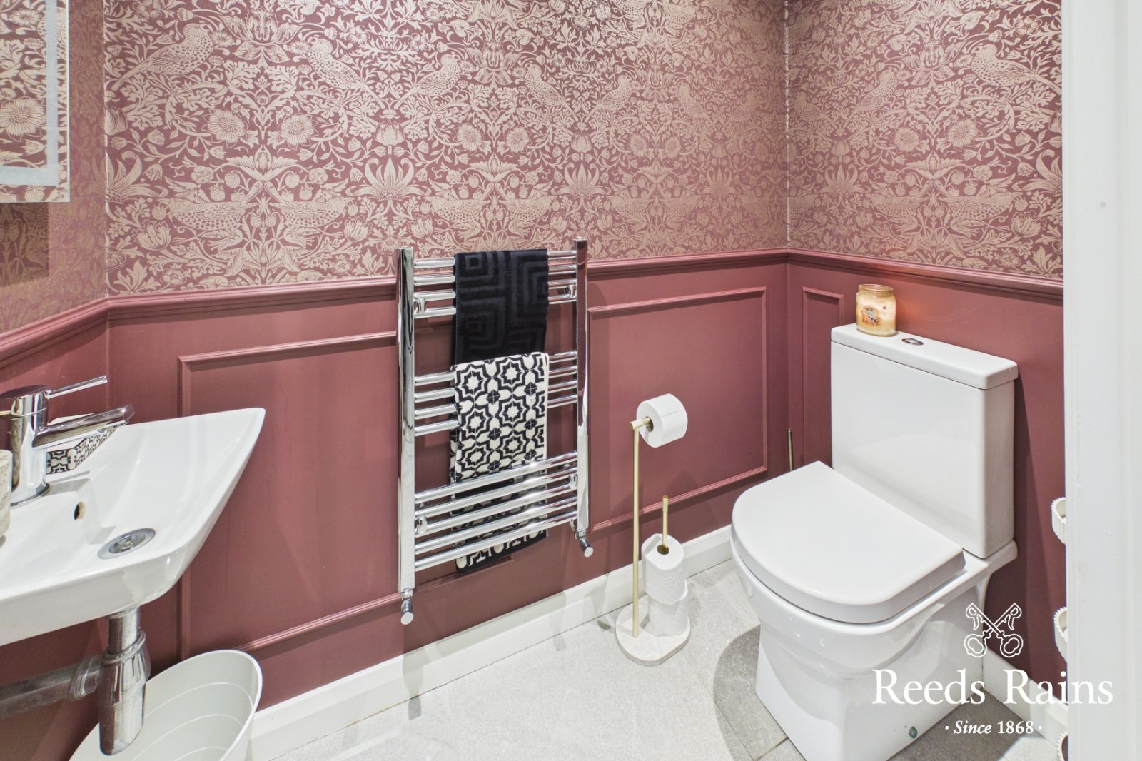 WC and wash hand basin. Heated towel rail. Tiled floor.