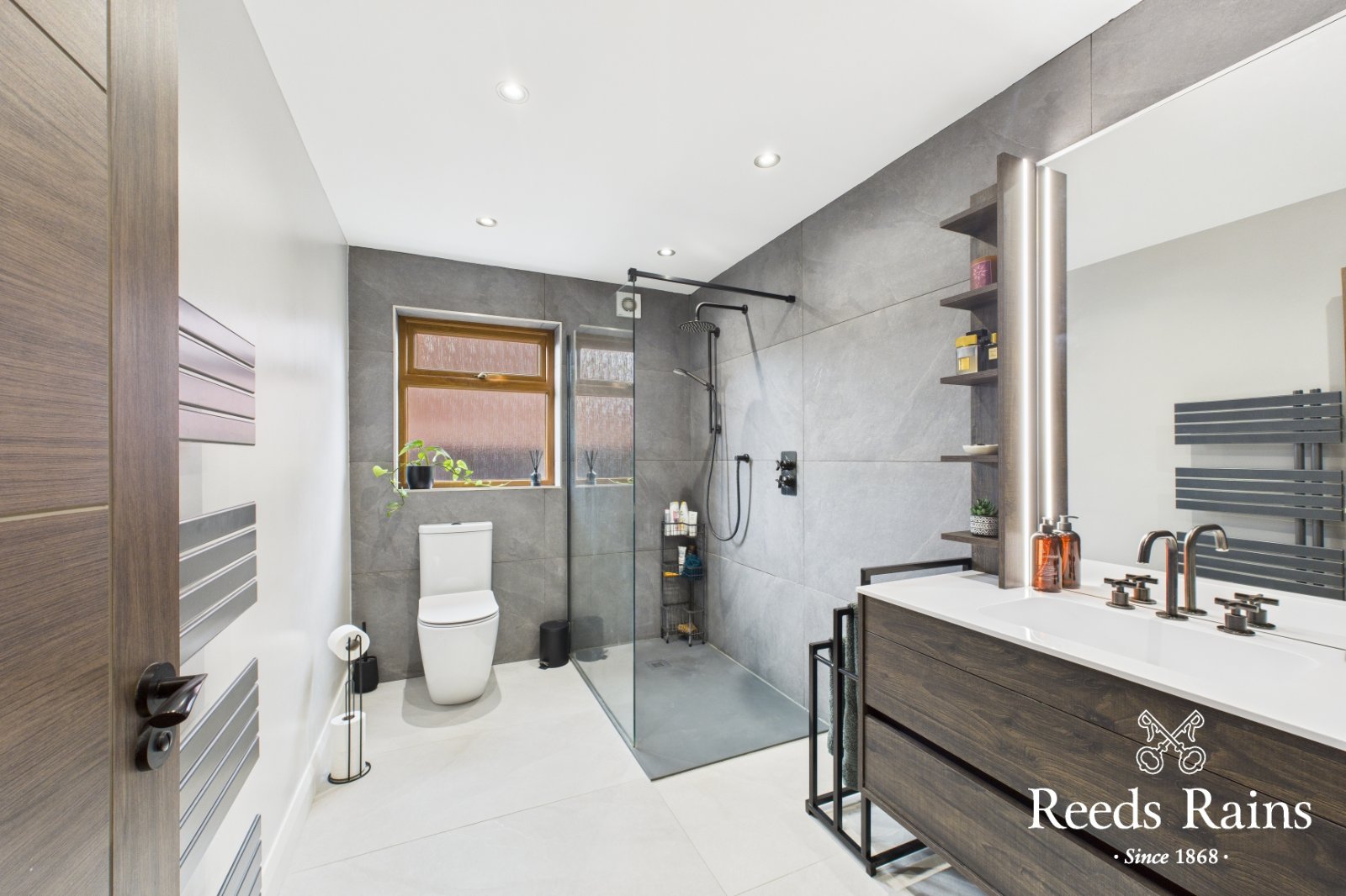 Walk in shower area with rain head shower and shower attachment, wash hand basin and low flush wc. Part tiled walls and tiled floor. Heated towel rail.