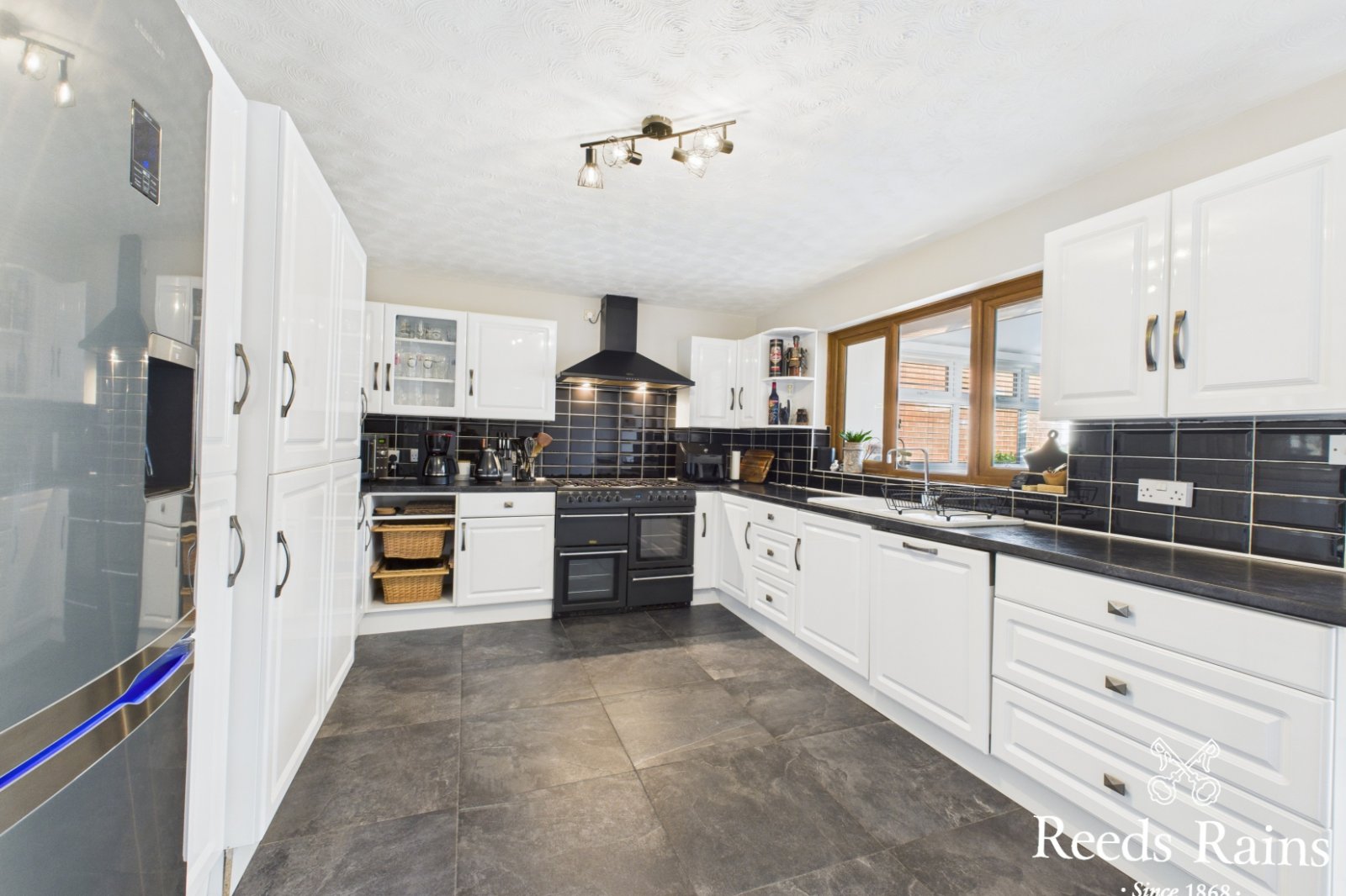 Range of fitted high and low level units. Single drainer stainless steel sink unit with mixer tap. Semi solid wood strip flooring.