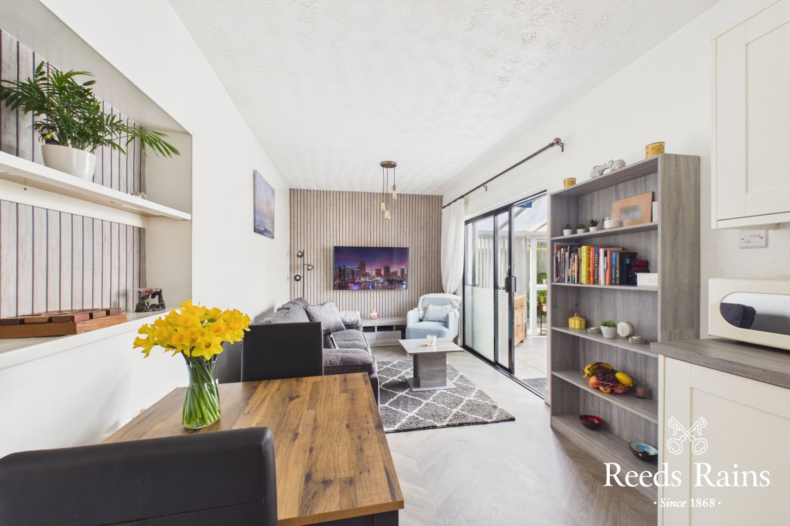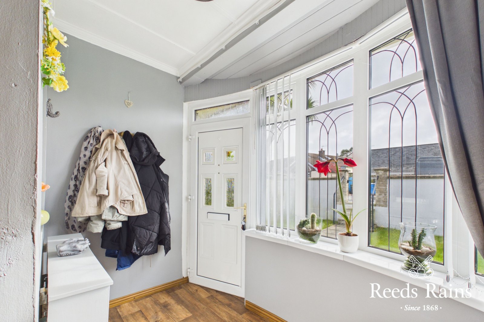PVC double glazed front door. Laminate wooden floor.