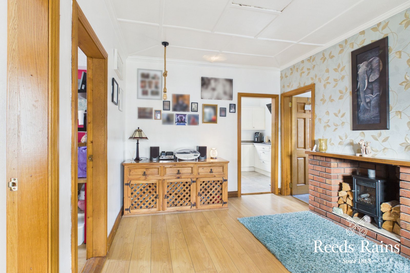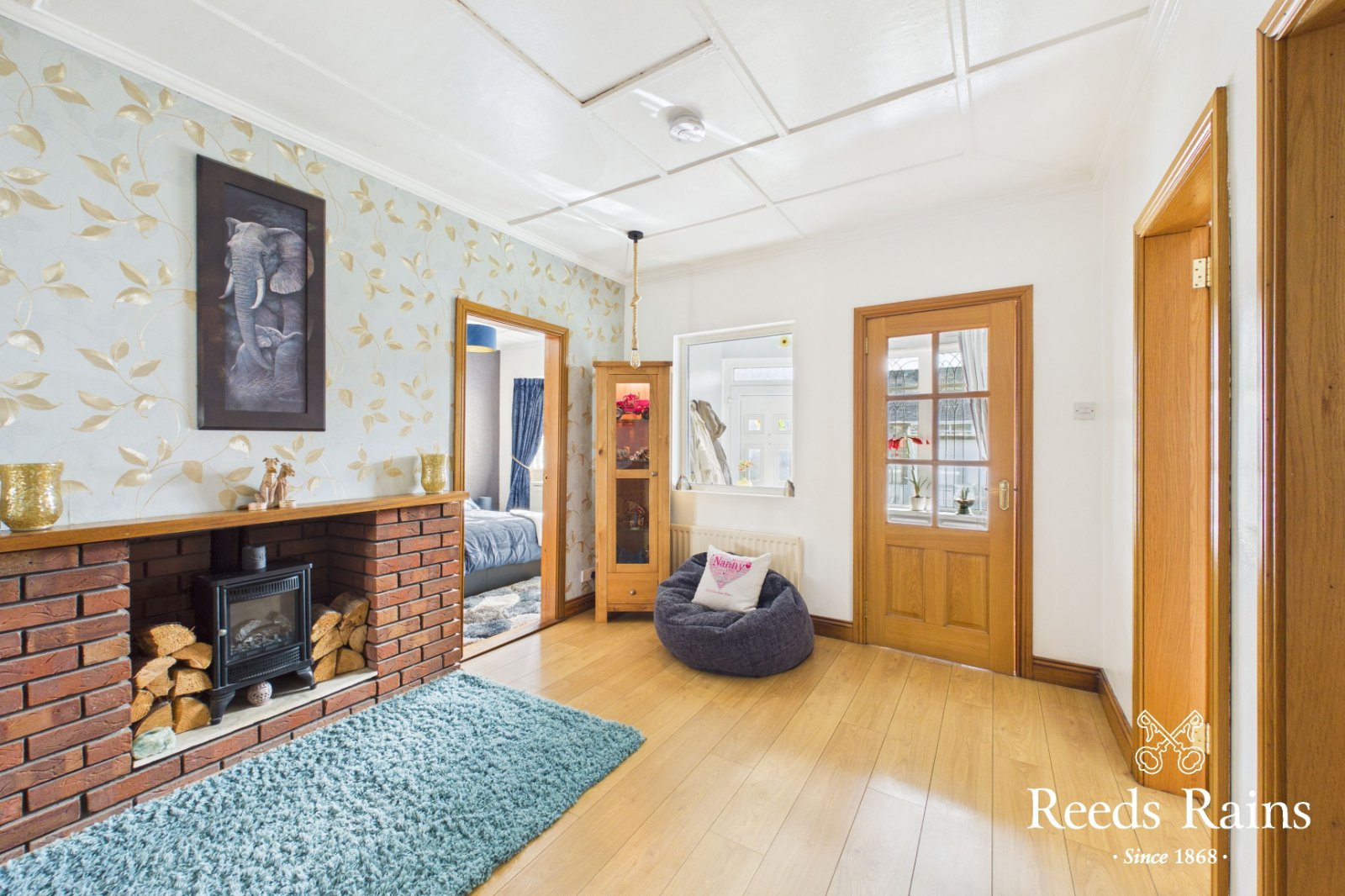 Laminate wooden floor. Brick surround fireplace with wooden hearth.