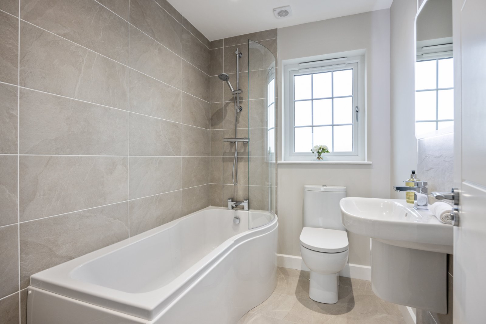 White suite comprising panelled bath with thermostatically controlled shower, wall hung wash hand basin and low flush wc. Part tiled walls. Ceramic tiled flooring.