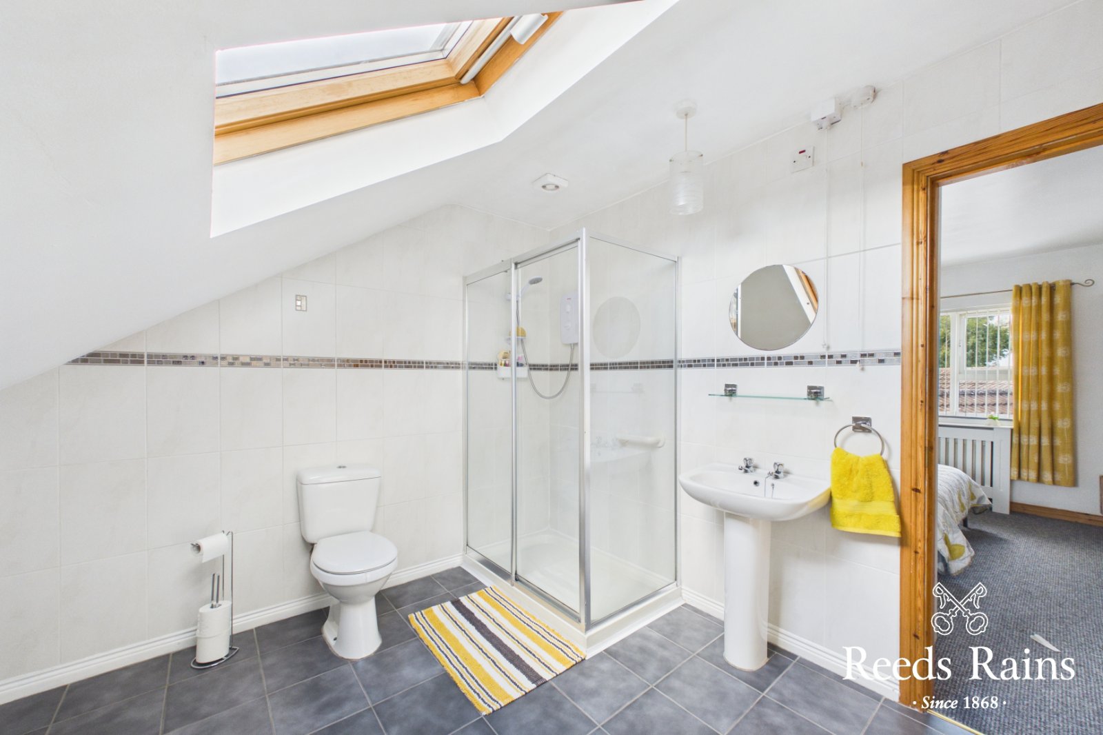 Superb four piece white suite comprising wood panelled bath, separate shower cubicle with wall mounted shower, pedestal wash hand basin and low flush wc.
