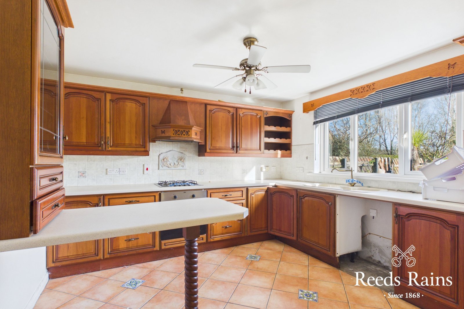 Rang of fitted high and low level units. Built in gas hob and under oven. Extractor fan. Integrated fridge/freezer and dishwasher. Breakfast bar. Part tiled walls. Ultimo vinyl plank flooring Wall mounted radiator.