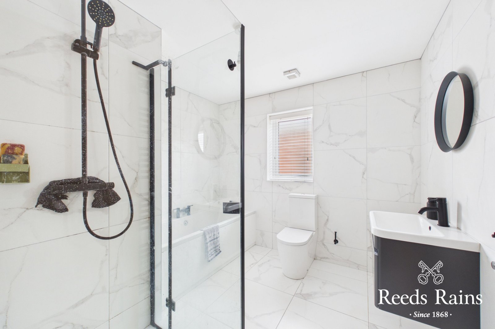 Deluxe four piece white suite comprising panelled bath, separate shower cubicle with wall mounted rain head shower and shower attachment, vanity unit and low flush wc. Heated towel rail. Tiled walls and floor.