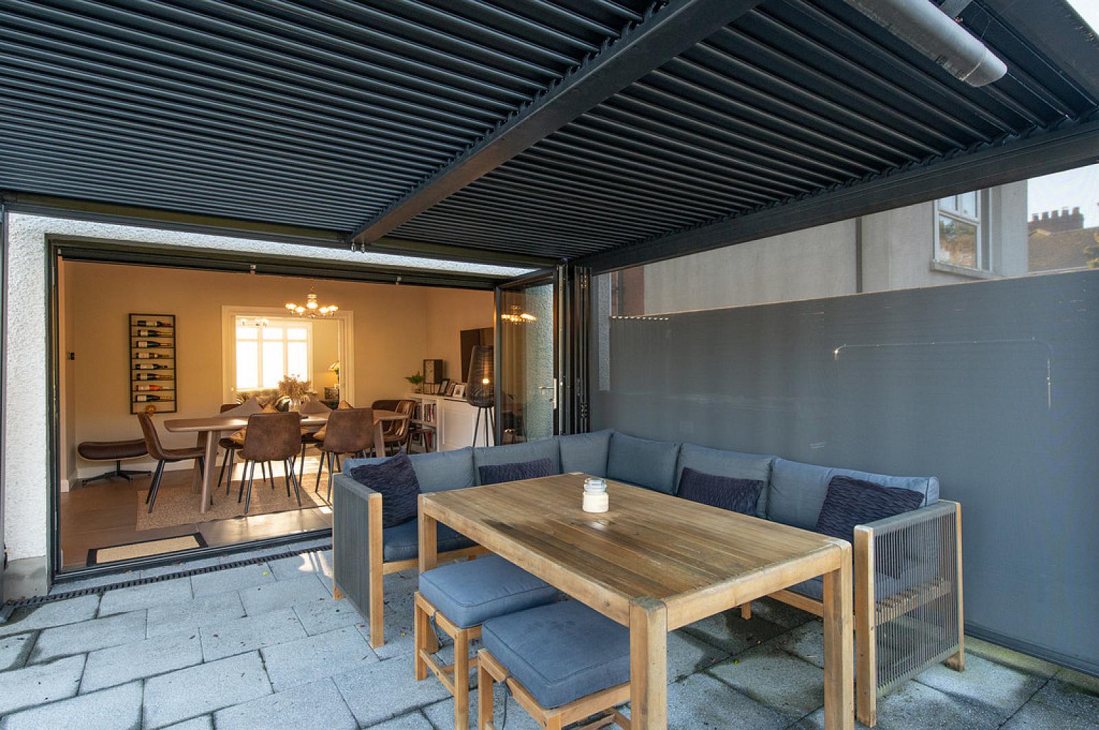 Casual dining area with built in cupboards, wired for flat screen, downlighters, built in folding door with electric blinds to patio area, feature pergola with electric heating, views towards Knockagh
