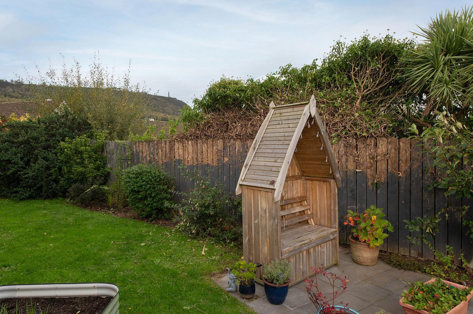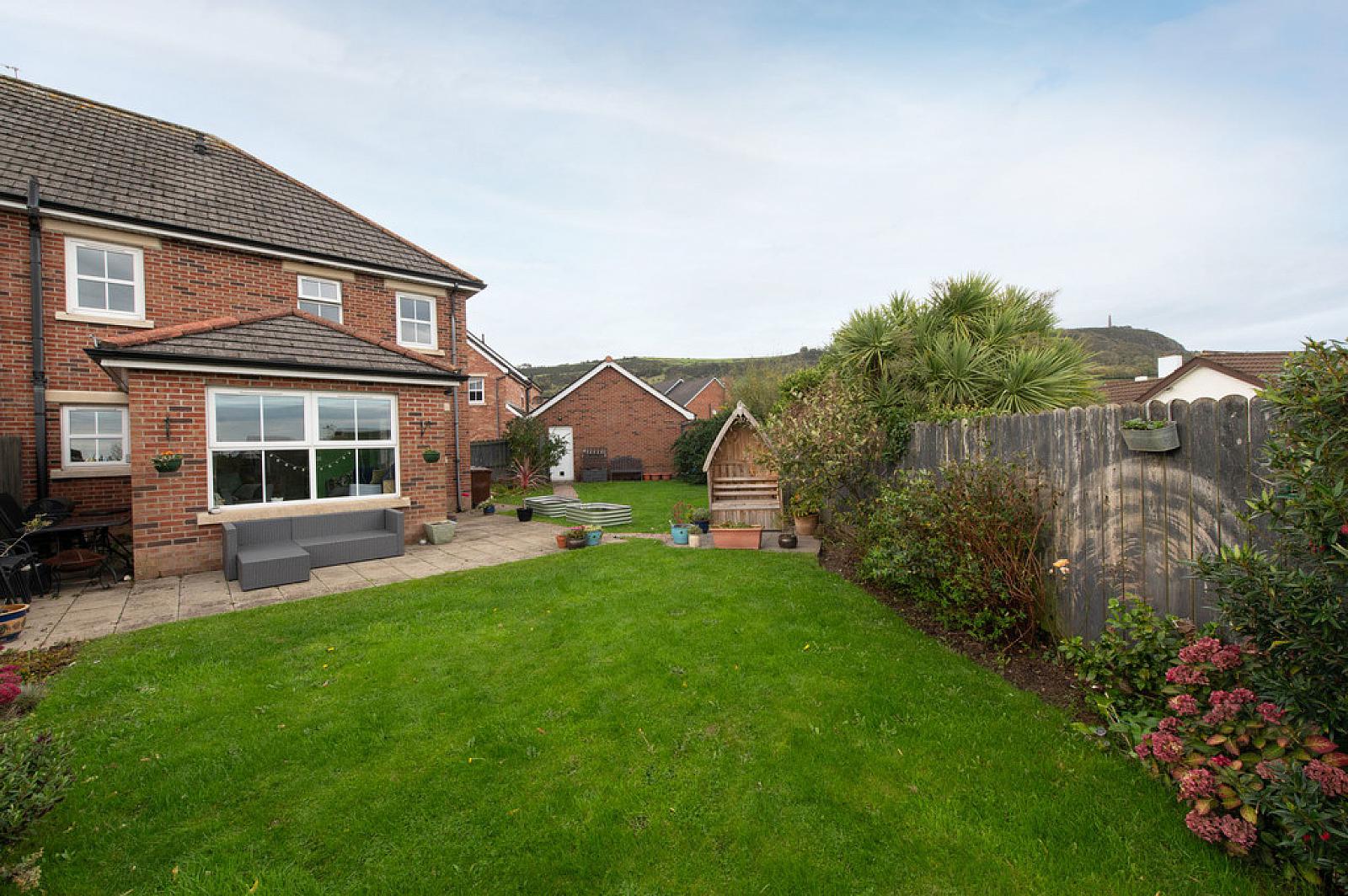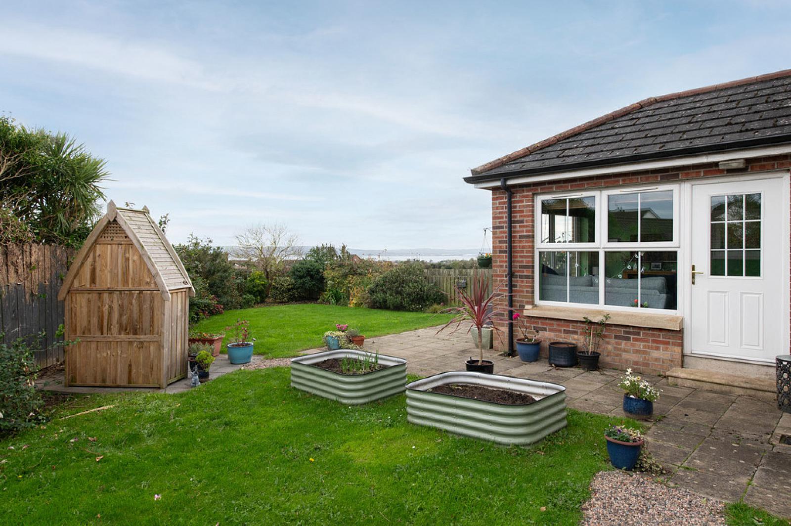 Rear in lawn, views of Belfast Lough/ Knockagh, two paved patio areas, water tap