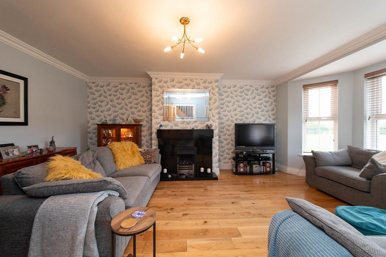 LOUNGE 18' 8" x 13' 3" (5.69m x 4.04m) Solid wood flooring, feature fireplace, gas fire fitted in, bay window