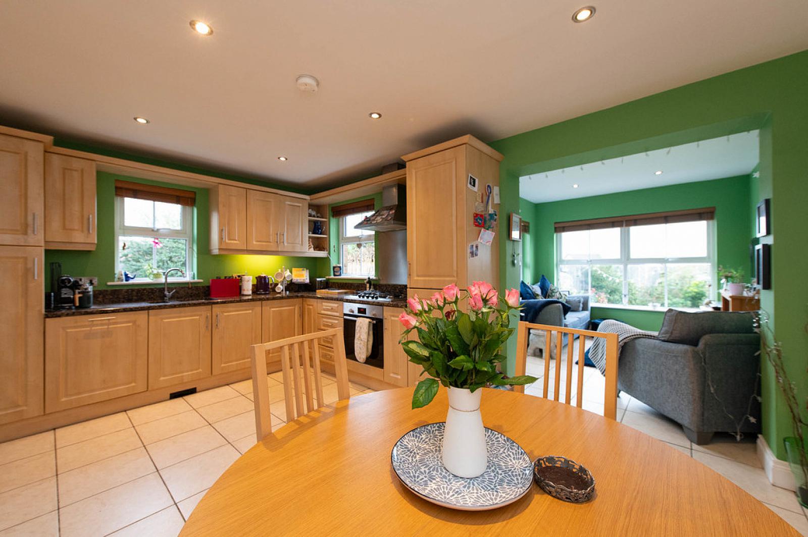 Modern fitted kitchen with casual dining area open plan to: