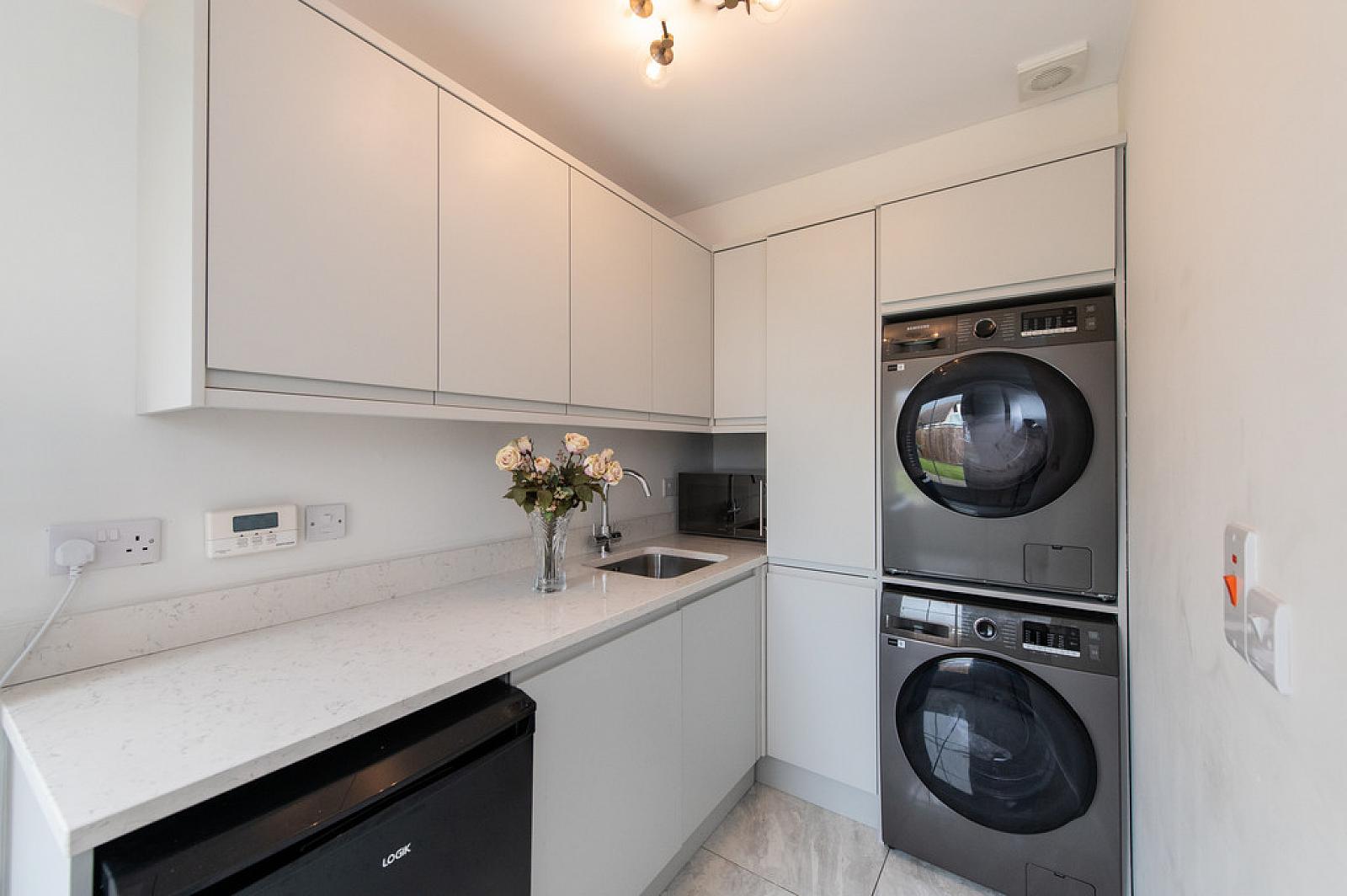 UTILITY ROOM 10' 4" x 5' 5" (3.15m x 1.65m) Range of high and low level units, granite worksurfaces, stainless steel sink unit with mixer tap, plumbed for double stacked washer dryer with built in bin storage, polished tiled flooring, door to rear