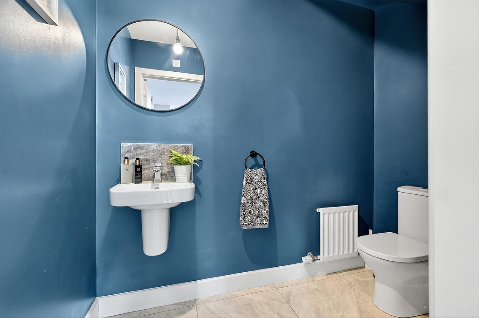 CLOAKS Low flush W/C, wall mounted wash hand basin, ceramic tiled flooring, extractor fan