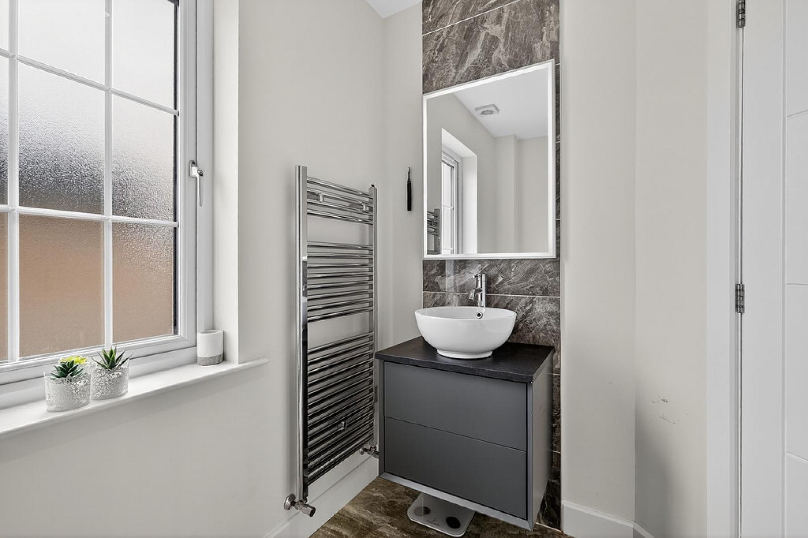 ENSUITE Low flush W/C, wall hung vanity unit with feature sink and mixer tap, corner glazed shower unit with rain shower and hand shower attachment, heated towel rail, built in light mirror, downlighters, extractor fan