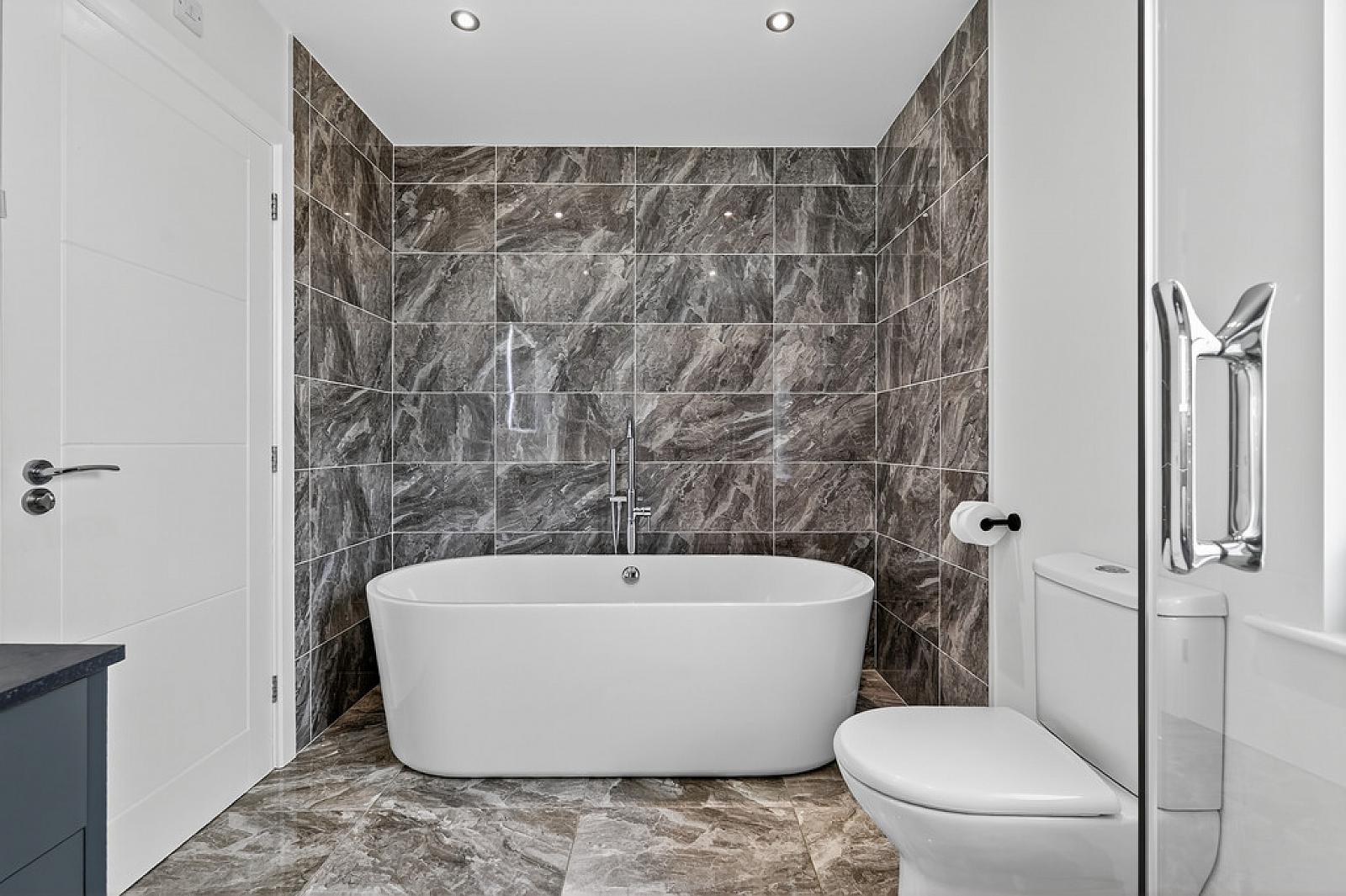 LUXURY WHITE BATHROOM SUITE Free standing bath unit with mixer tap and hand shower, wall hung vanity unit with mixer tap, low flush W/C, large shower unit with rain shower and hand shower, heated towel rail, polished tiled flooring, heated mirror, luxury tiling
