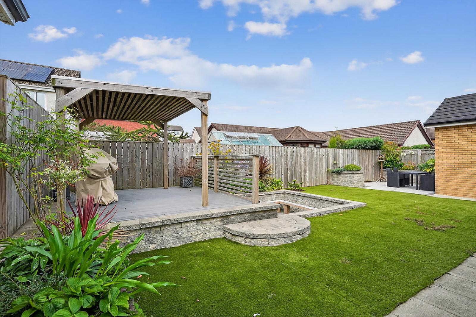 Rear in raised composite decking with covered pergola, 4 flower beds along garden boundary, dug in composite decking sitting area/ fire pit.