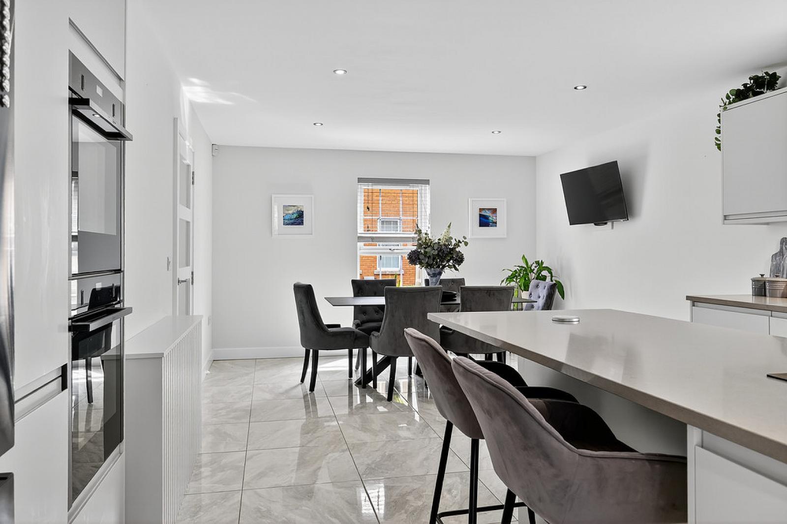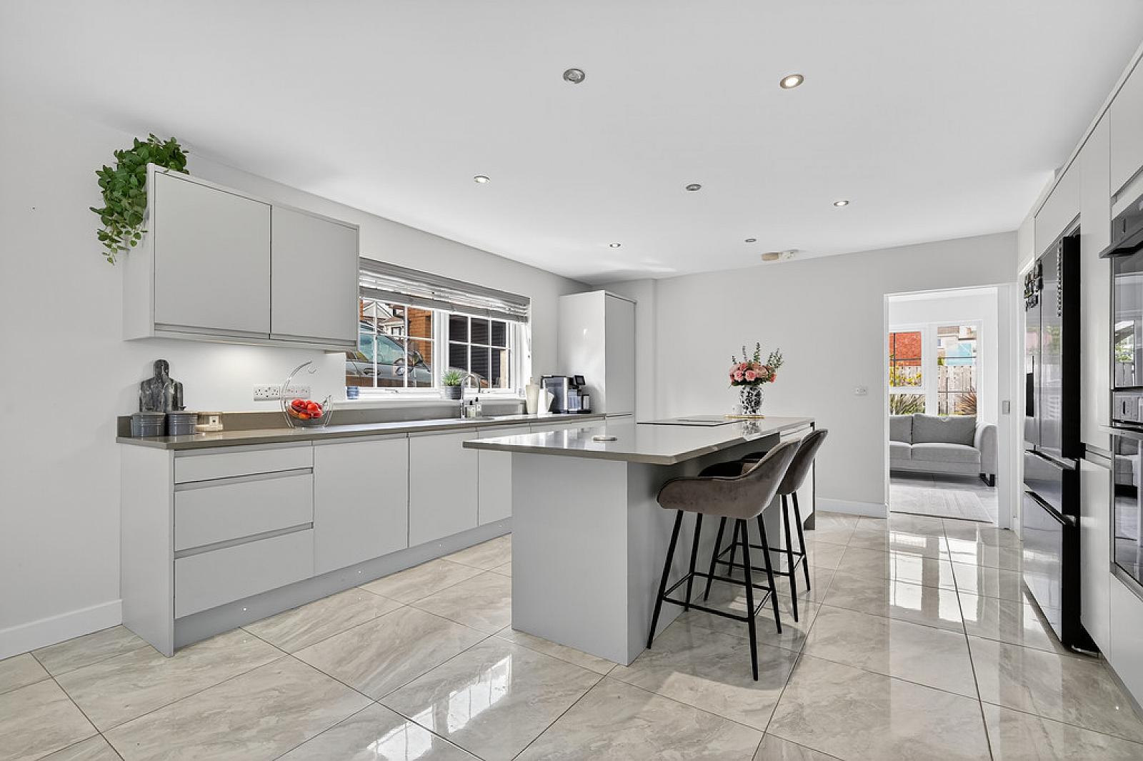 KITCHEN 25' 7" x 12' 9" (7.8m x 3.89m) Luxury fitted kitchen with range of high and low level units, Quartz worksurfaces, two built in Neff fan assisted oven with air fryer features, space for American style fridge freezer, sink unit with Quooker boiling tap, built in dishwasher, Neff gas induction hob, extractor fan, gas boiler, large island with casual lounge/ dining area, wired for flatscreen, luxury floor tiling, sliding door to sunroom,