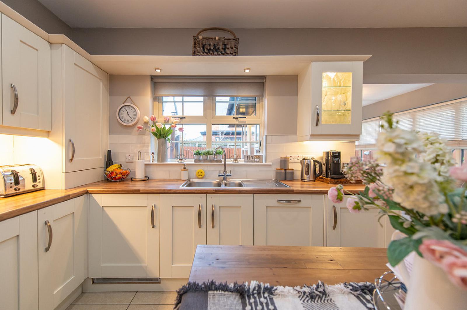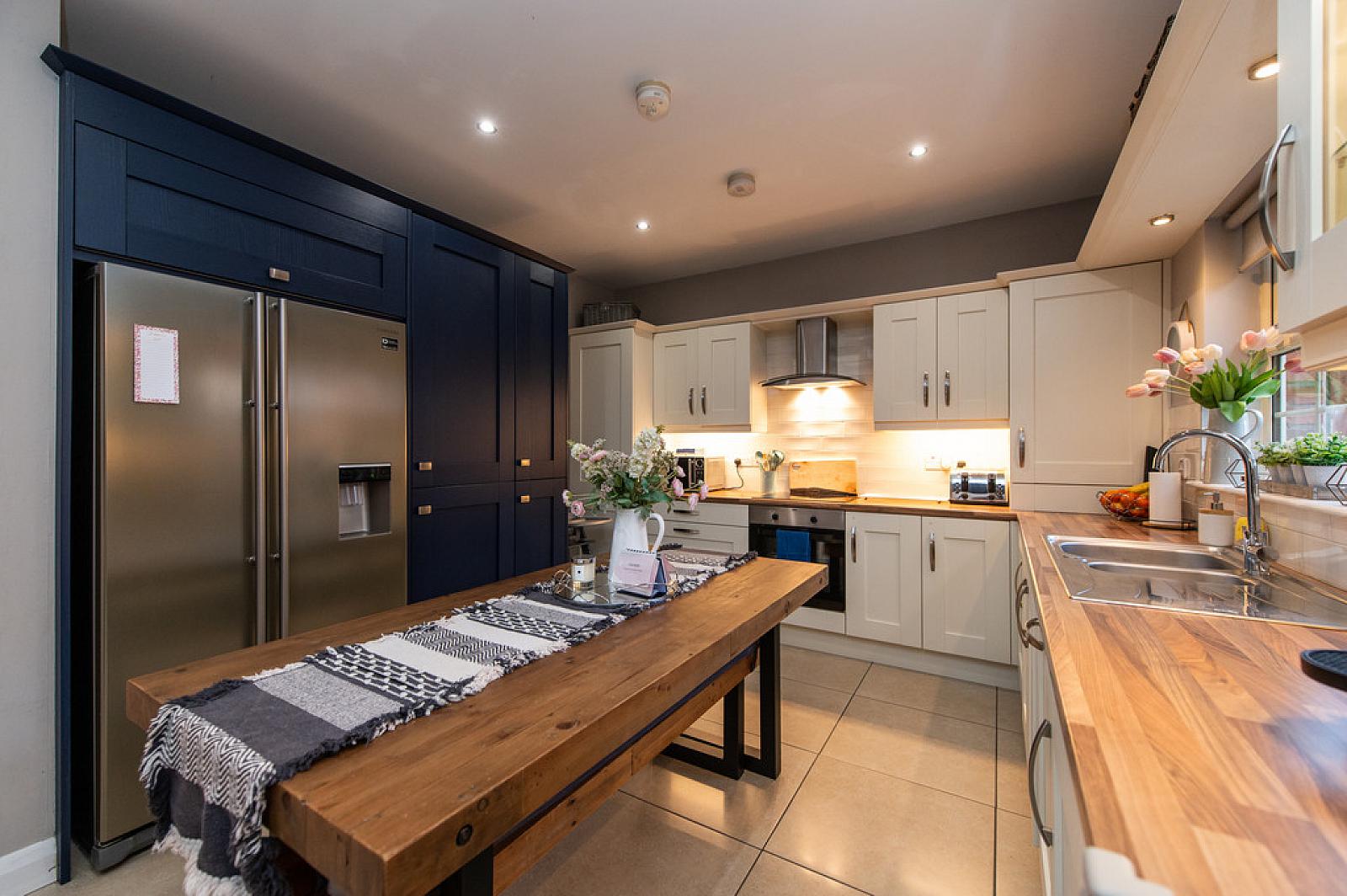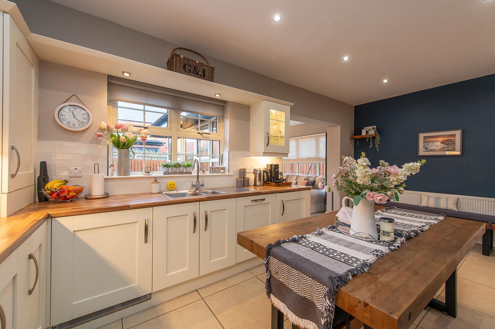 KITCHEN 18' 5" x 11' 8" (5.61m x 3.56m) Modern fitted kitchen with range of high and low level units, round edge worksurfaces, stainless steel sink unit with mixer tap, built in hob, fan assisted oven, stainless steel extractor fan, built in tumble dryer, built in dishwasher, built in washing machine, tiling, ceramic tiled flooring, casual dining area, downlighters, open plan