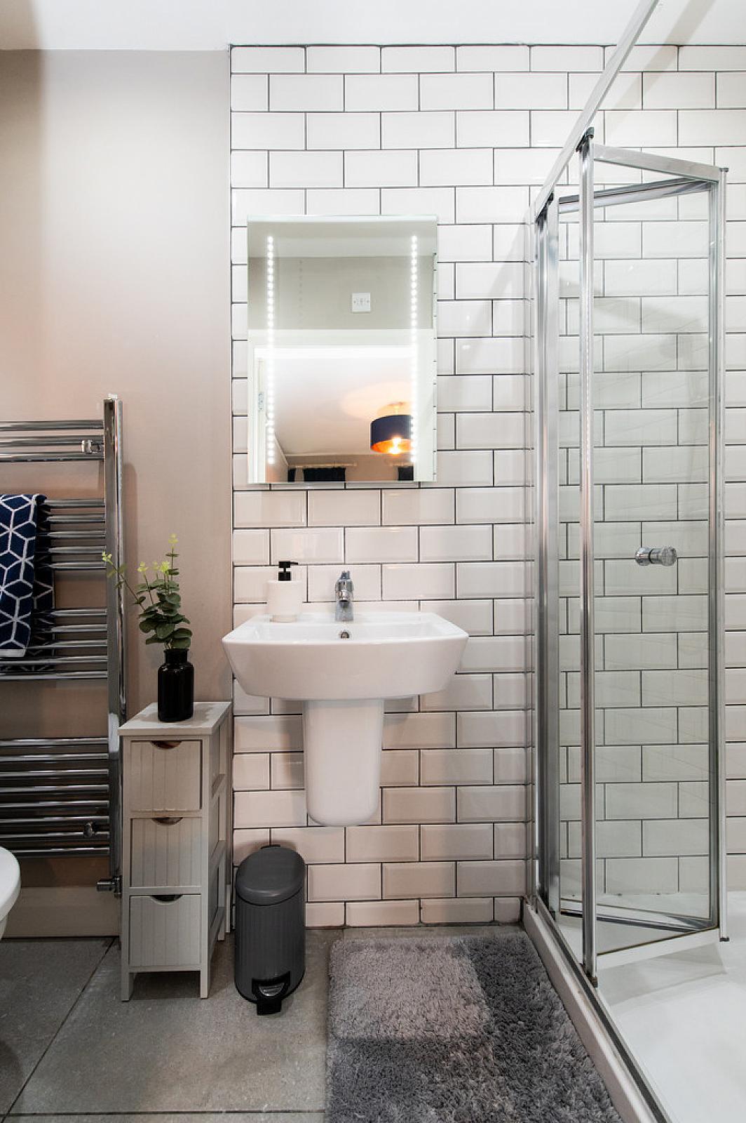 BATHROOM White bathroom suite, corner bath, low flush W/C, vanity unit with drawers, corner glazed shower unit with rain shower, luxury tiling, ceramic tiled flooring, extractor fan, heated towel rail