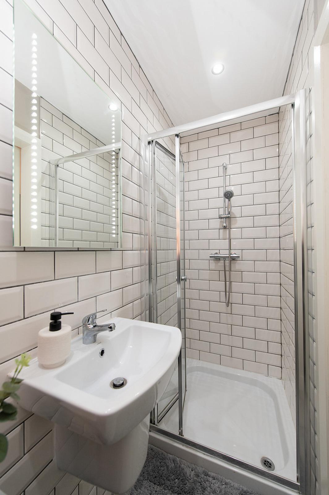ENSUITE Low flush W/C, wall hung wash hand basin, wash hand basin, corner glazed shower unit with controlled shower, luxury tiling, heated towel rail, folding doors