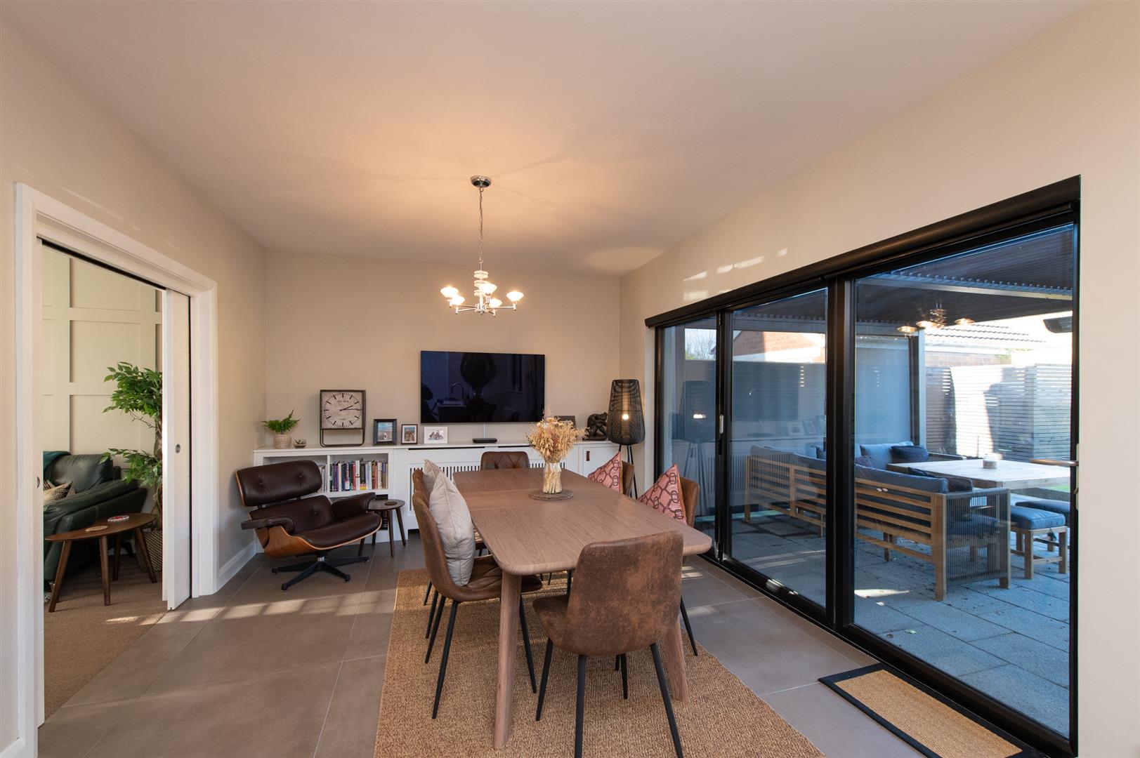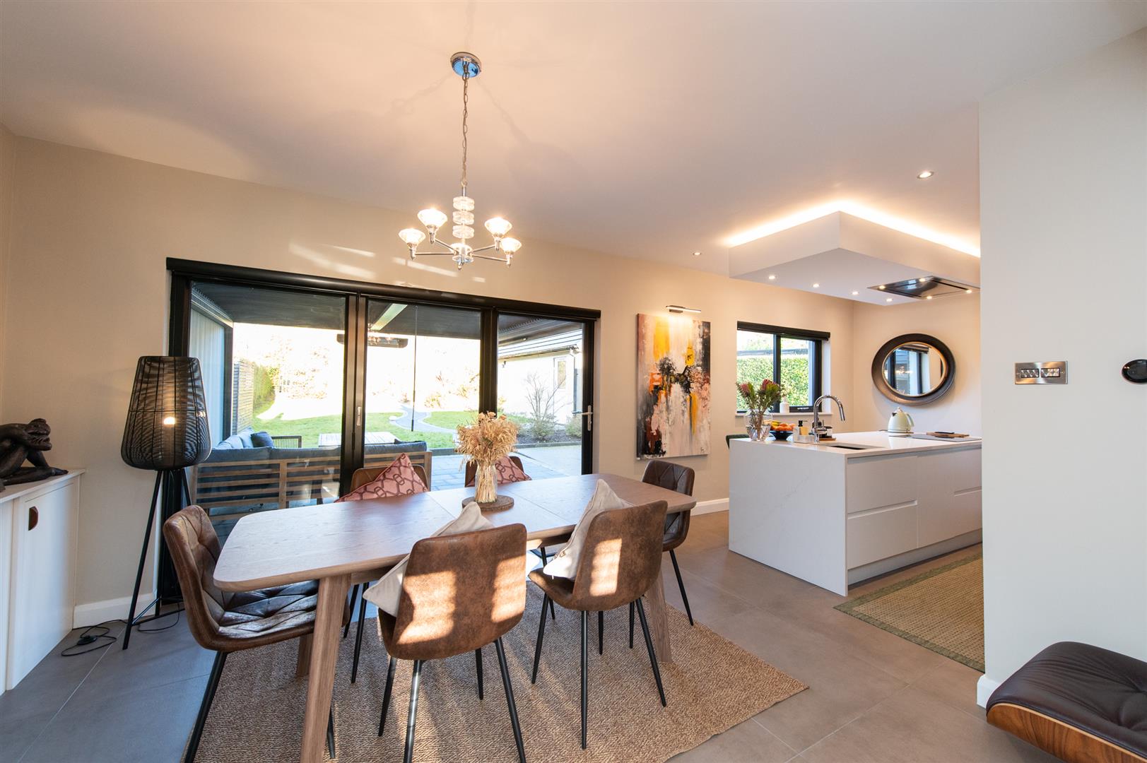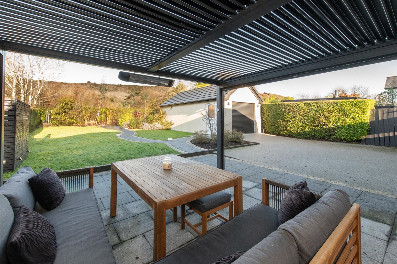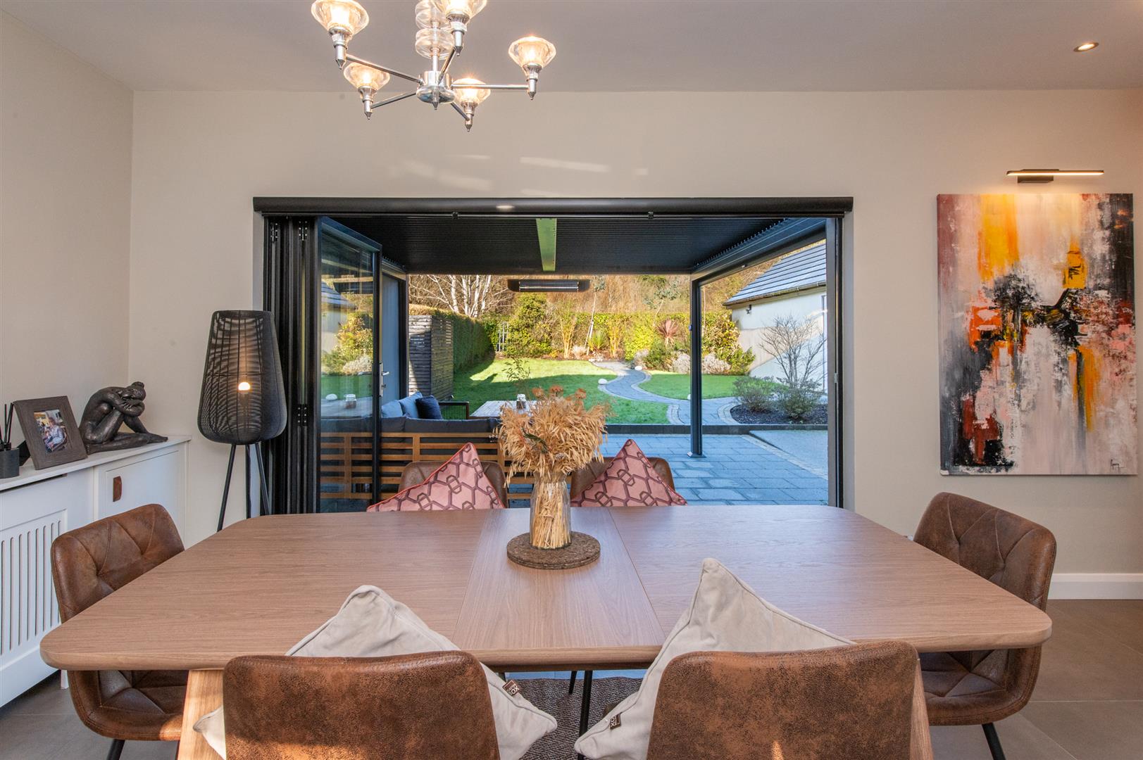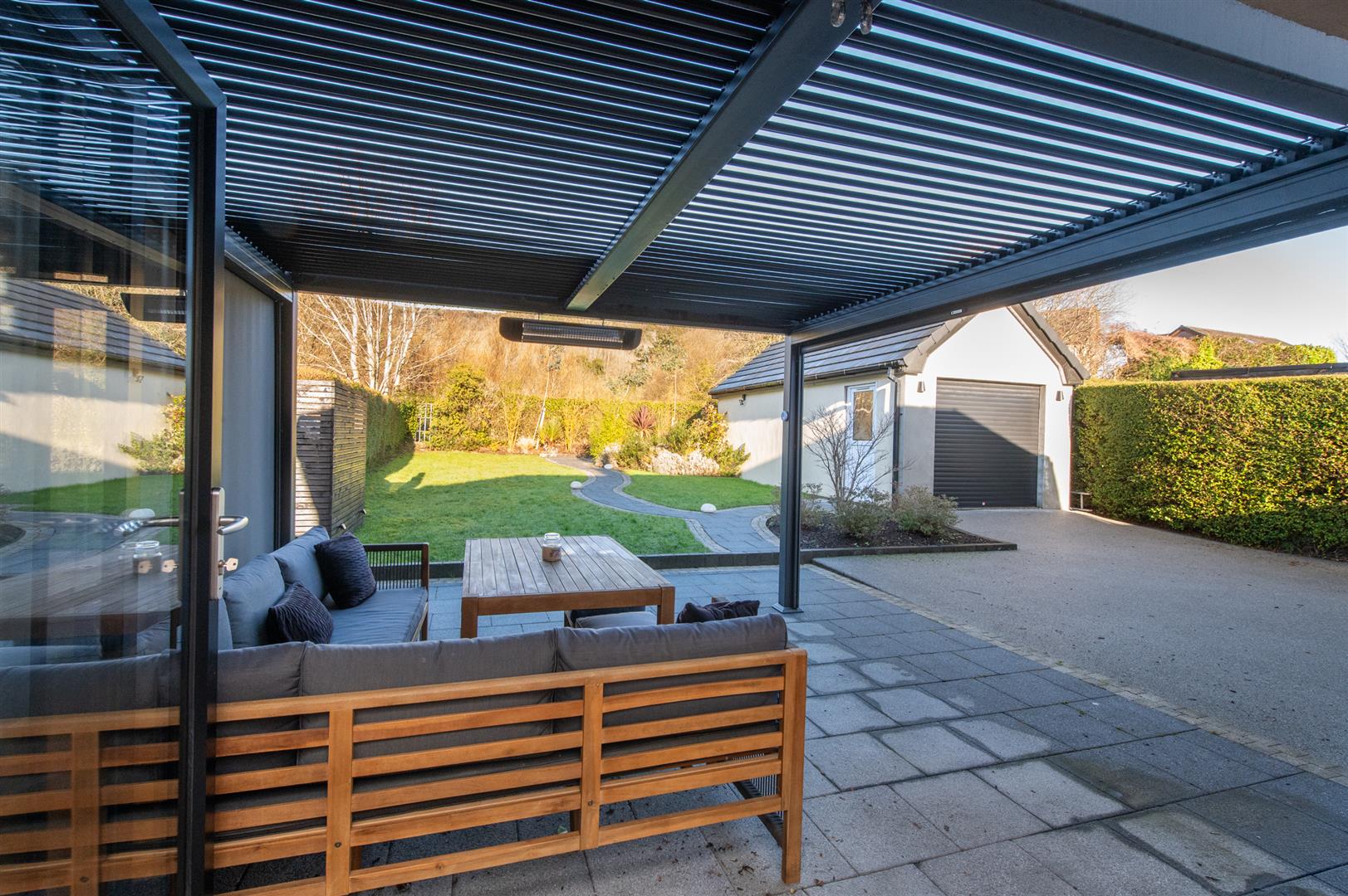 Casual dining area with built in cupboards, wired for flat screen, downlighters, built in folding door with electric blinds to patio area, feature pergola with electric heating, views towards Knockagh