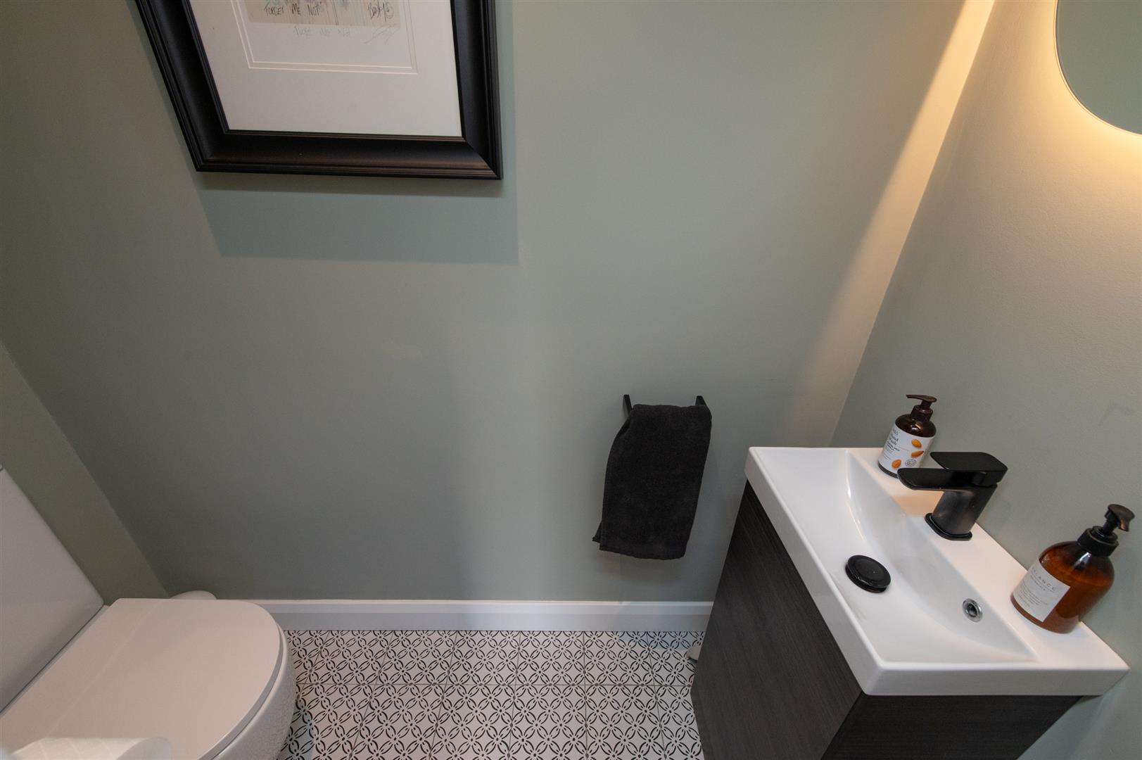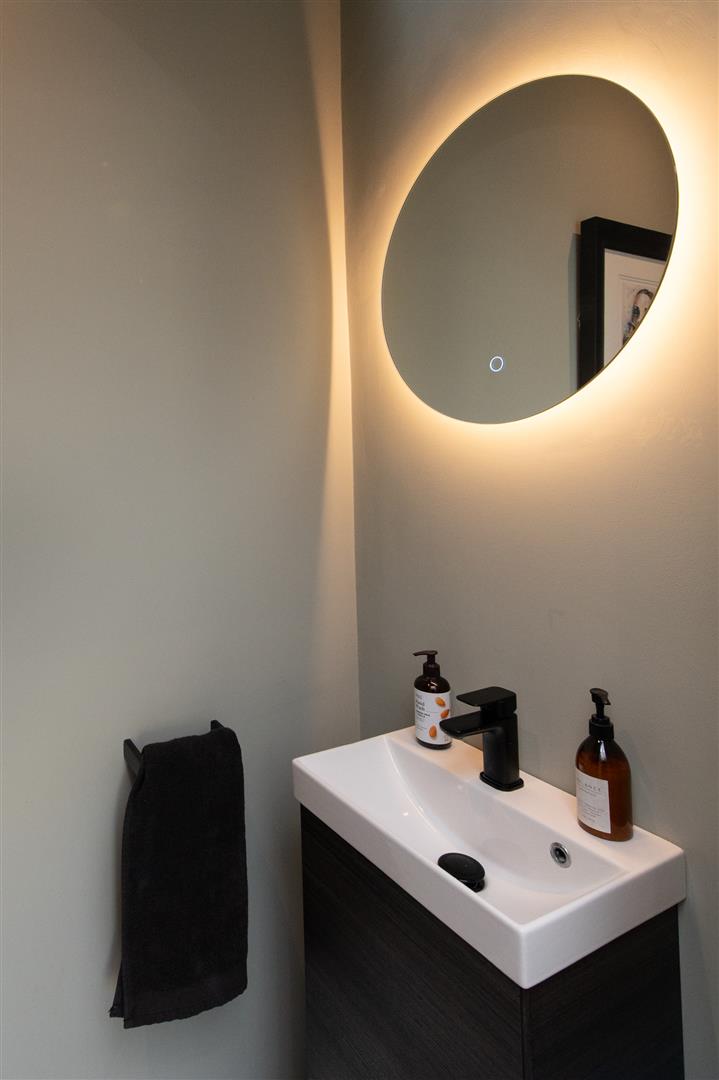 Low flush WC, vanity unit with mixer tap, ceramic tiled flooring, feature mirror, downlighters