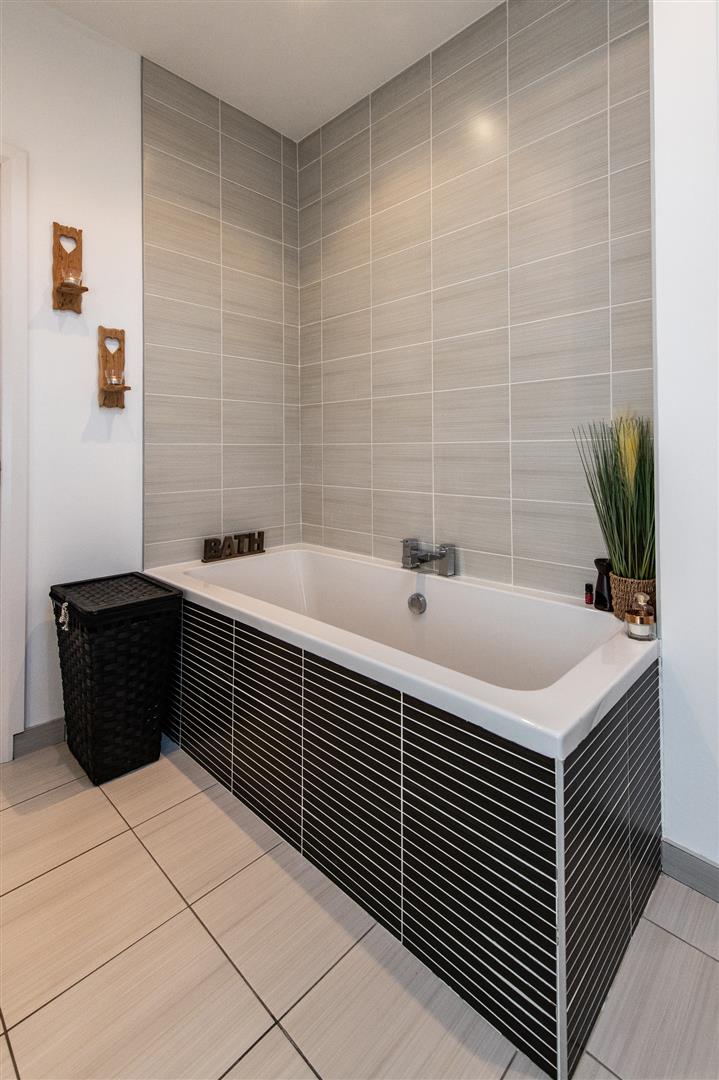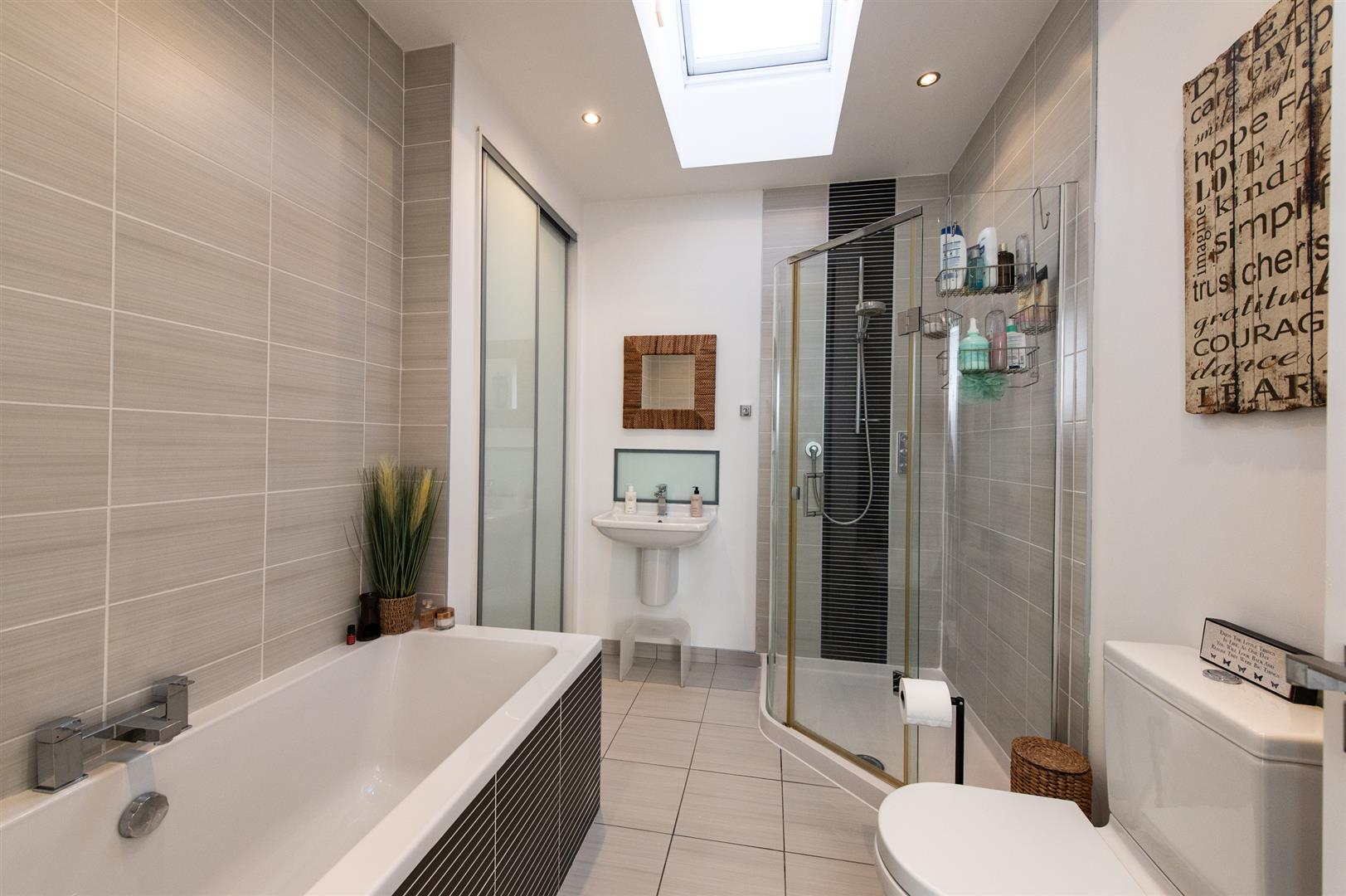 Luxury white bathroom suite, built in bath with mixer tap, wall hung wash hand basin, larger corner glazed shower unit with controlled shower, low flush WC, linen cupboard with insulated copper cylinder, ceramic tiled flooring, electric Velux window, downlighters