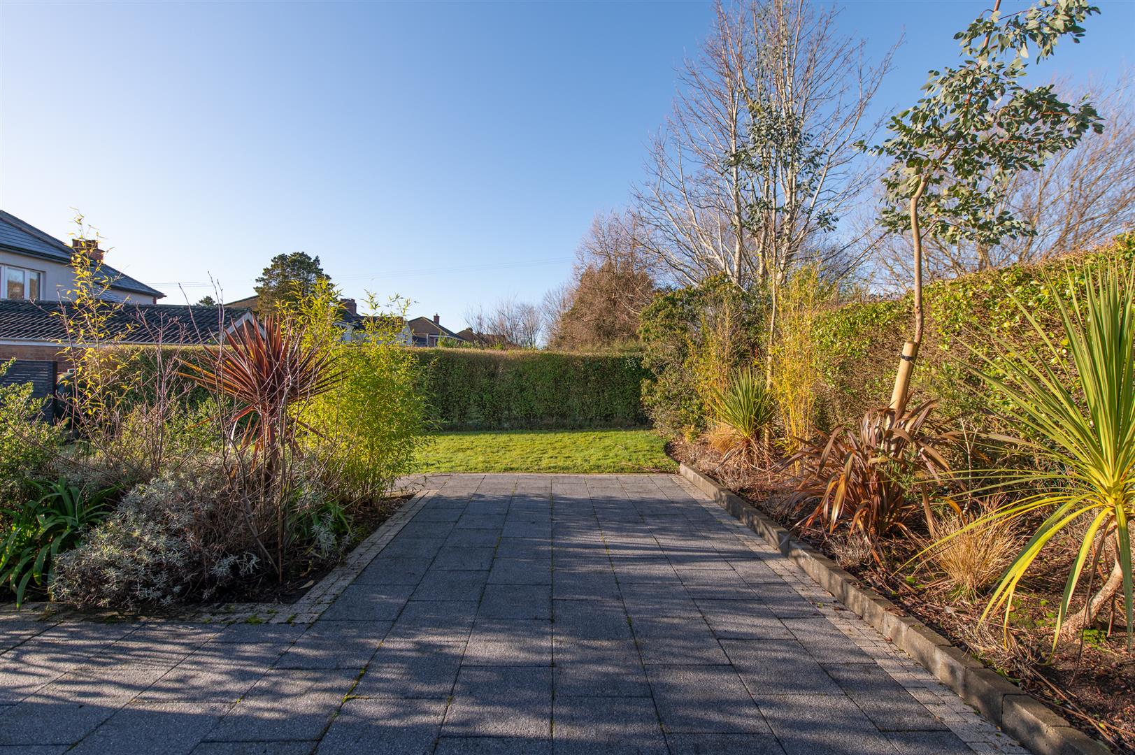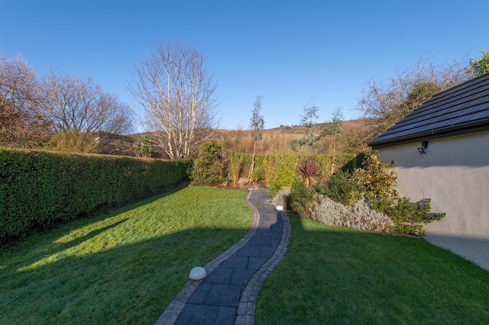 Landscaped garden to the rear comprising patio area with enclosed pergola, in lawn, plants, trees and shrubs with additional patio area with views of Knockagh, water tap, external plug socket, pergola, boiler house with oil fired condensing boiler