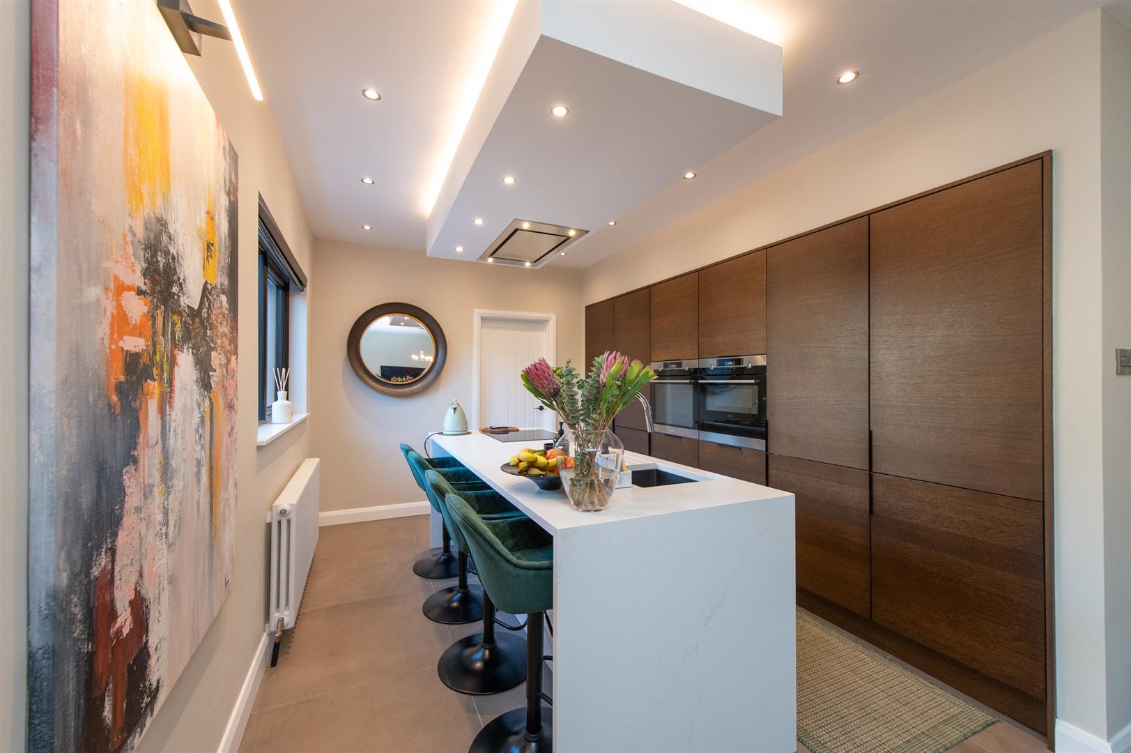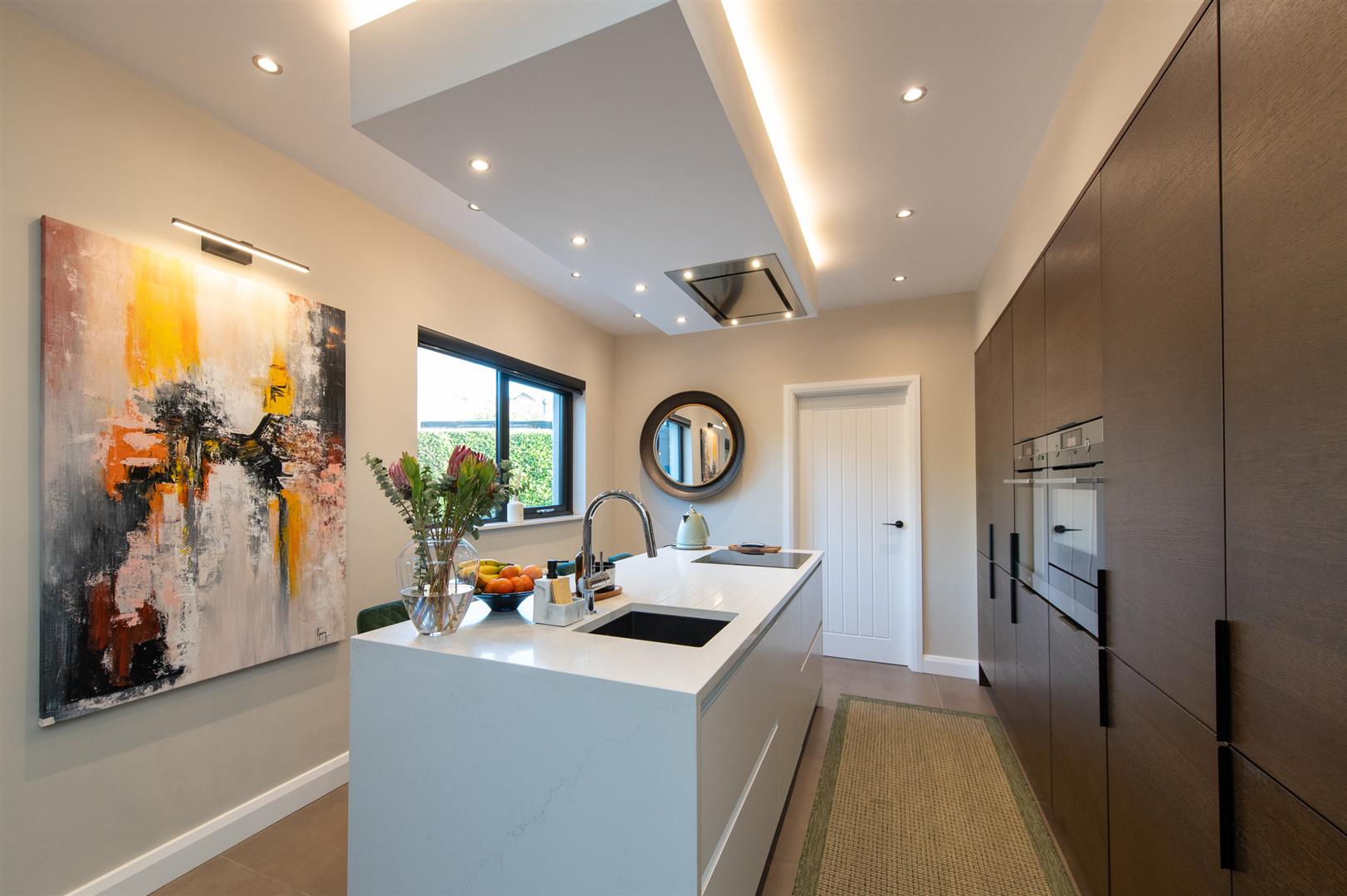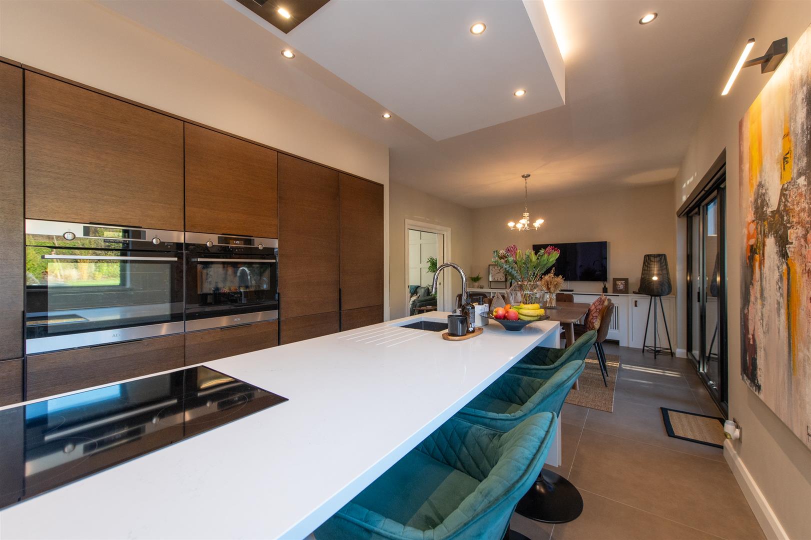 Luxury fitted kitchen with range of high and low level units, two built in Aeg fan assisted ovens with warming drawers, built in fridge and freezer, island with Quartz solid worksurfaces, incorporate sink unit with drainer, built in dishwasher, built in induction hob with ceiling Airforce extractor fan with feature lighting, electric blinds