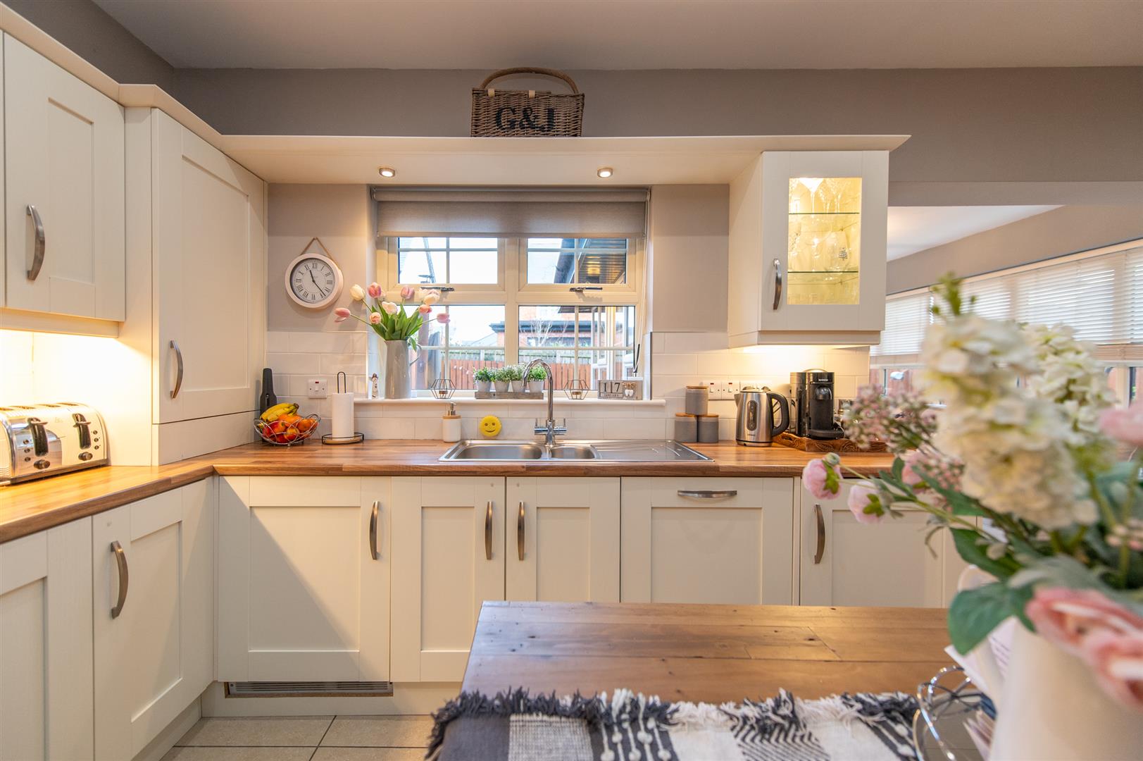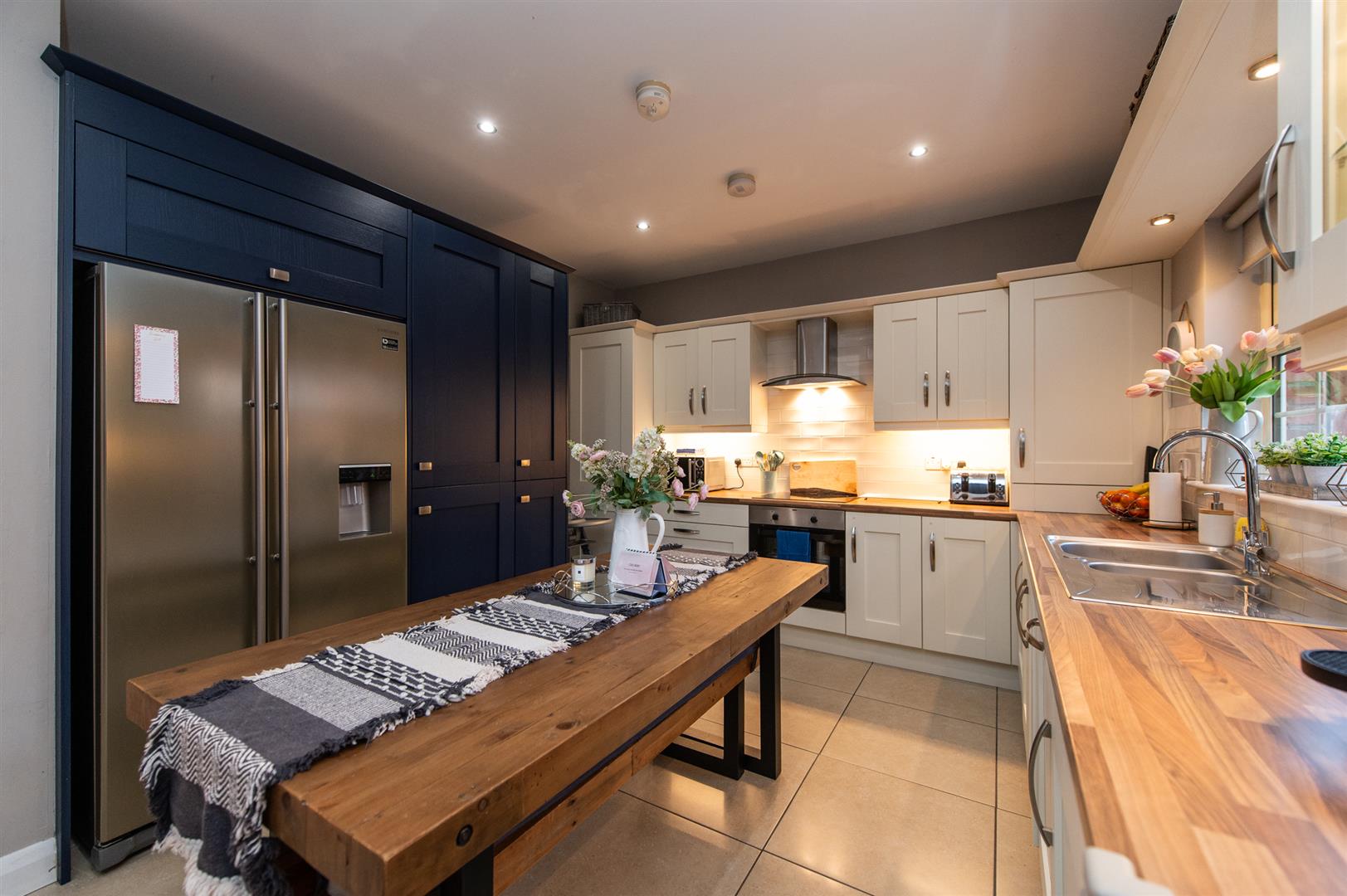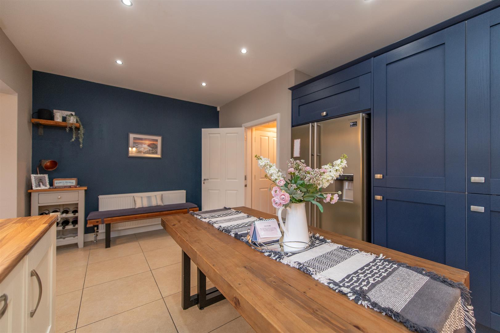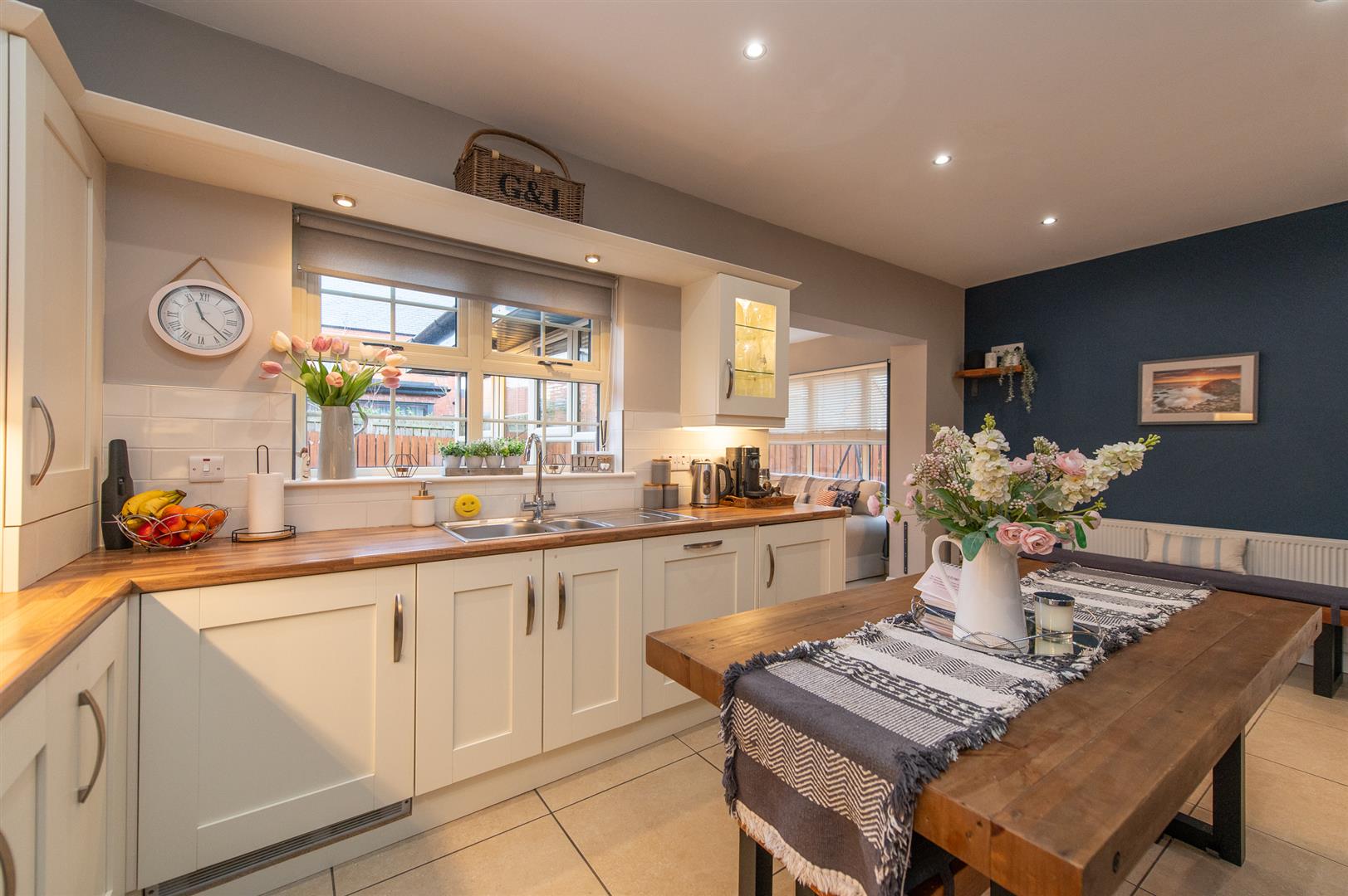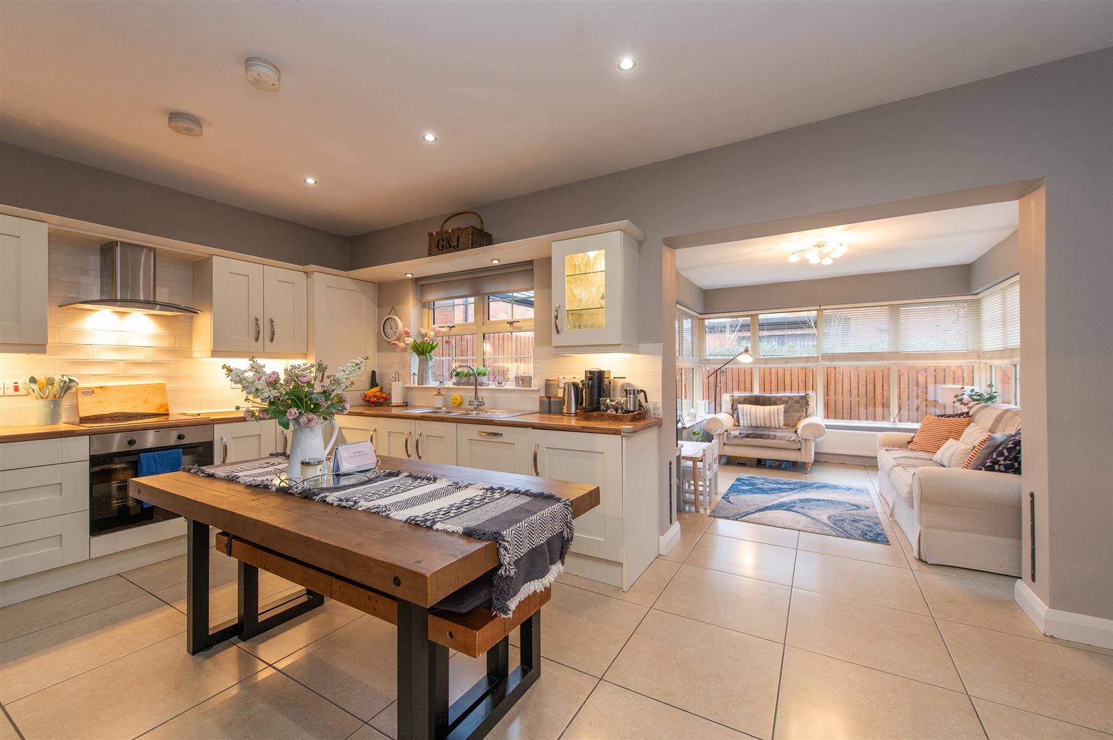 Modern fitted kitchen with range of high and low level units, round edge worksurfaces, stainless steel sink unit with mixer tap, built in hob, fan assisted oven, stainless steel extractor fan, built in tumble dryer, built in dishwasher, built in washing machine, tiling, ceramic tiled flooring, casual dining area, downlighters, open plan
