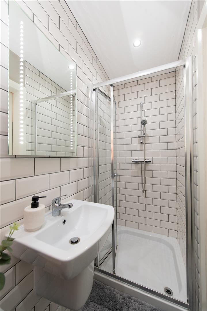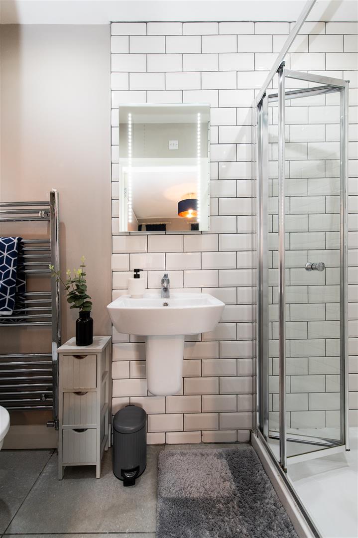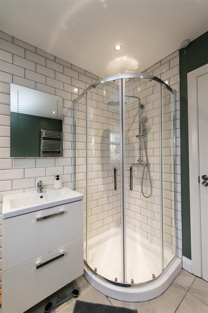 Low flush W/C, wall hung wash hand basin, wash hand basin, corner glazed shower unit with controlled shower, luxury tiling, heated towel rail, folding doors