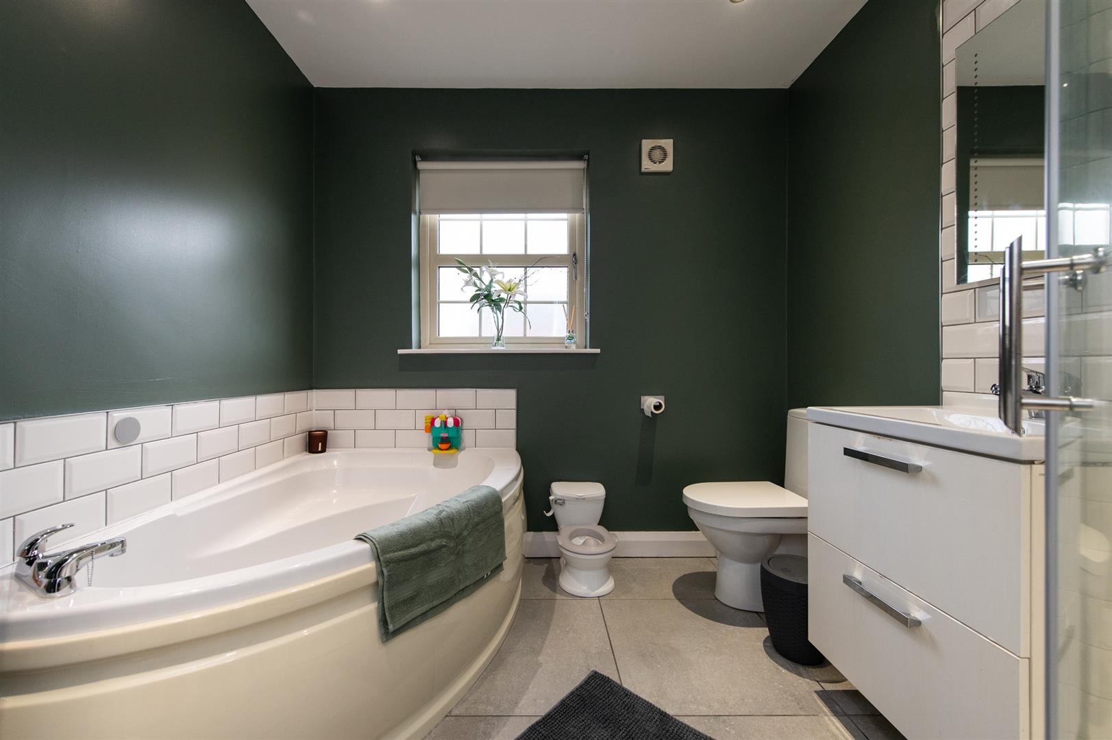 White bathroom suite, corner bath, low flush W/C, vanity unit with drawers, corner glazed shower unit with rain shower, luxury tiling, ceramic tiled flooring, extractor fan, heated towel rail