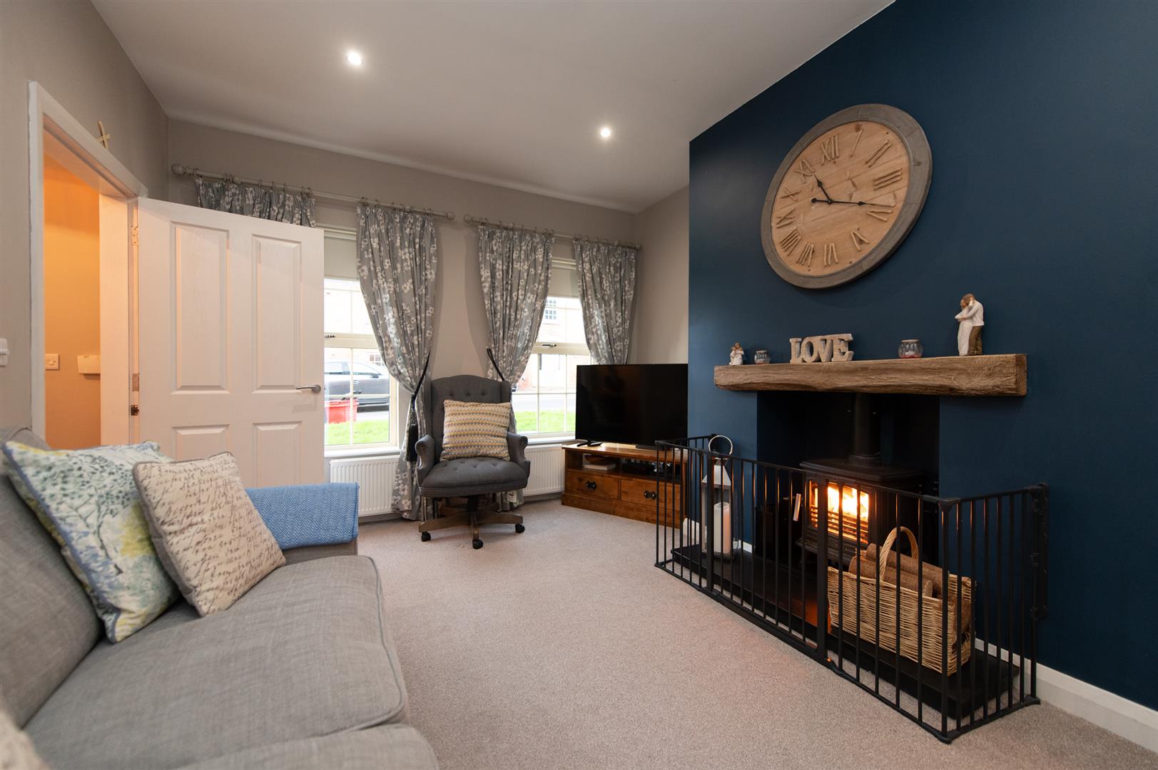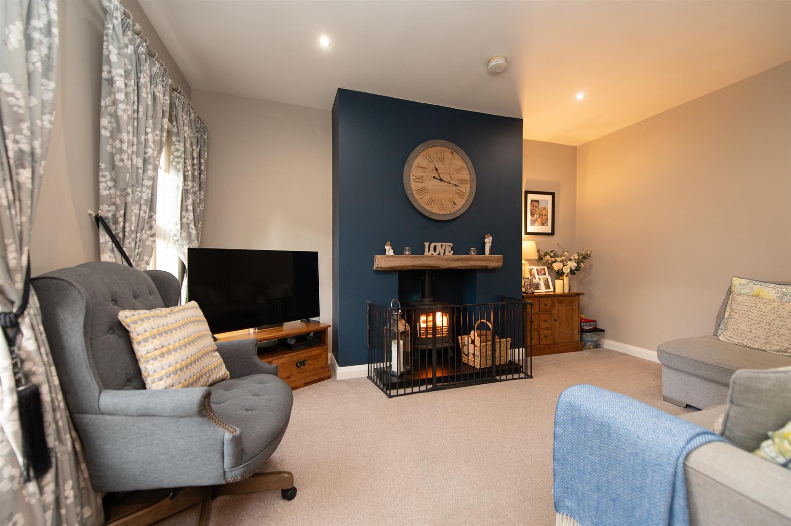 Log burning stove, slate mantle hearth, downlighters