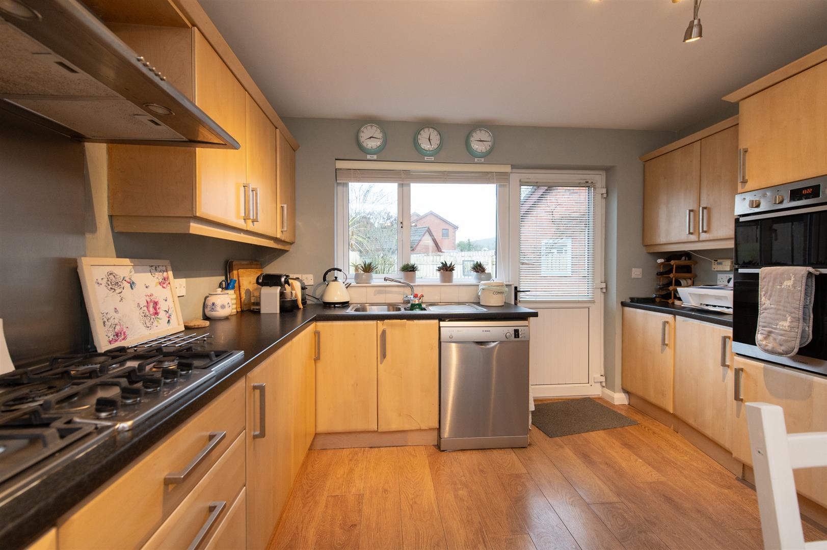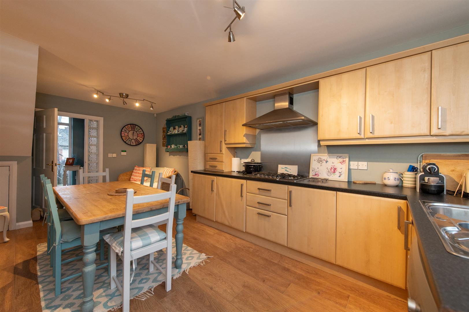 Fitted kitchen with range of high and low level units, round edge worksurfaces, stainless steel sink unit with mixer taps and vegetable sink, built in gas hob and stainless steel extractor fan, plumbed for dishwasher, built in double oven, space for fridge freezer.