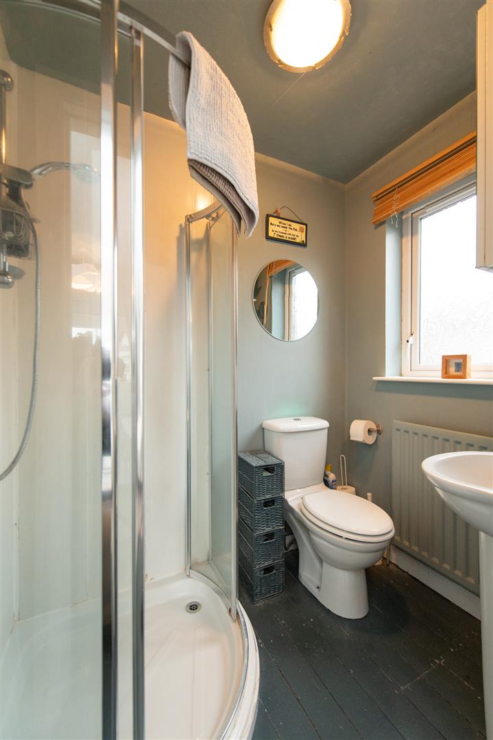 Low flush W/C, pedestal wash hand basin, corner glazed shower unit with controlled shower, uPVC tiling, painted floorboards