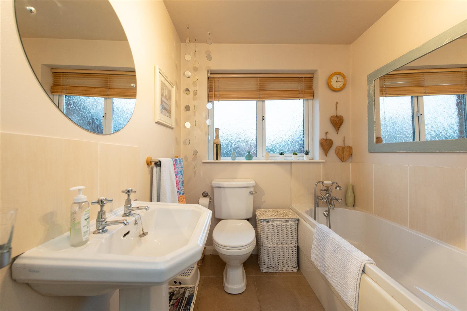 White bathroom suite, low flush W/C, panelled bath with mixer tap and hand shower, glazed shower unit with controlled shower, tiling, ceramic tiled flooring