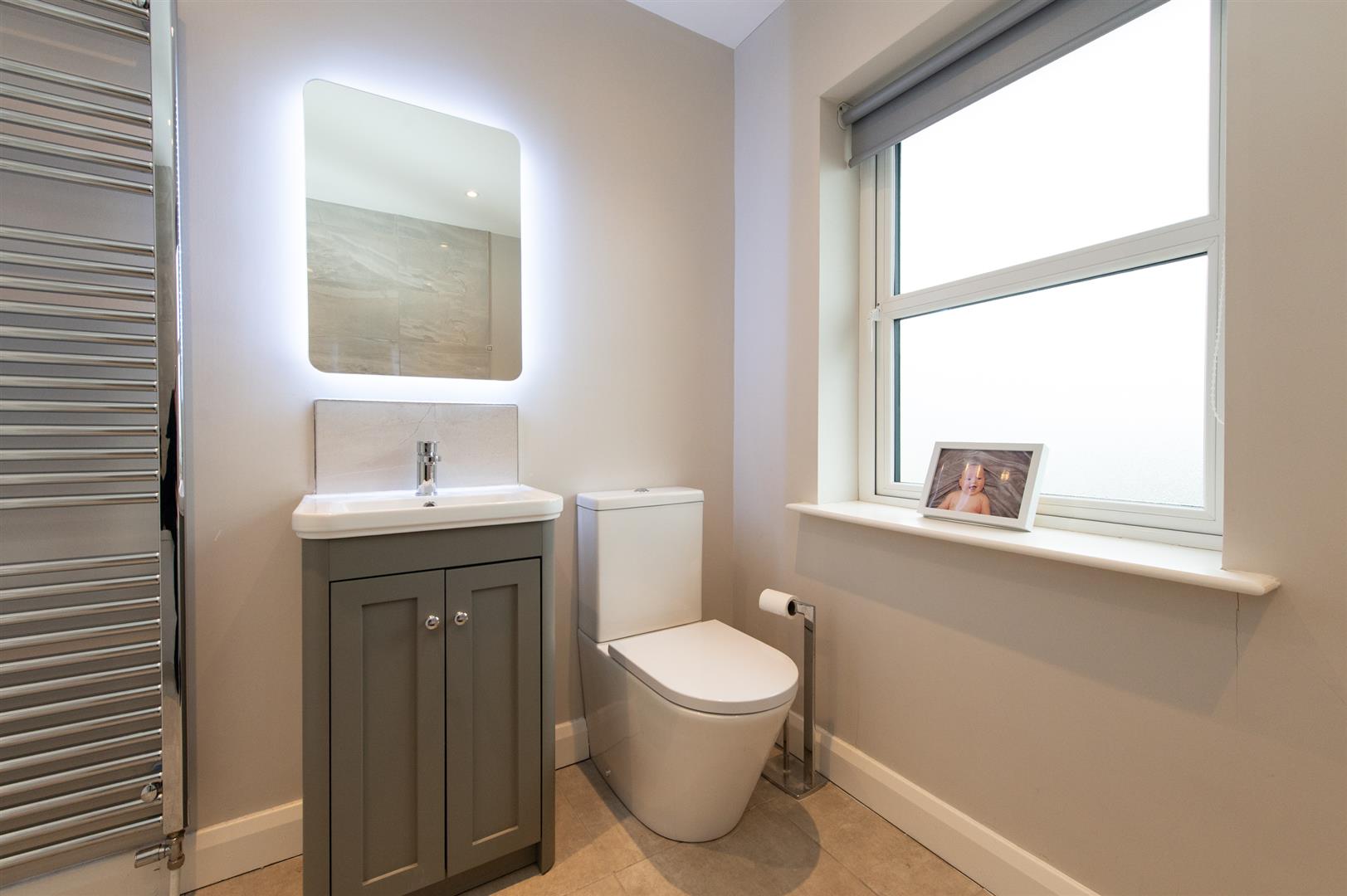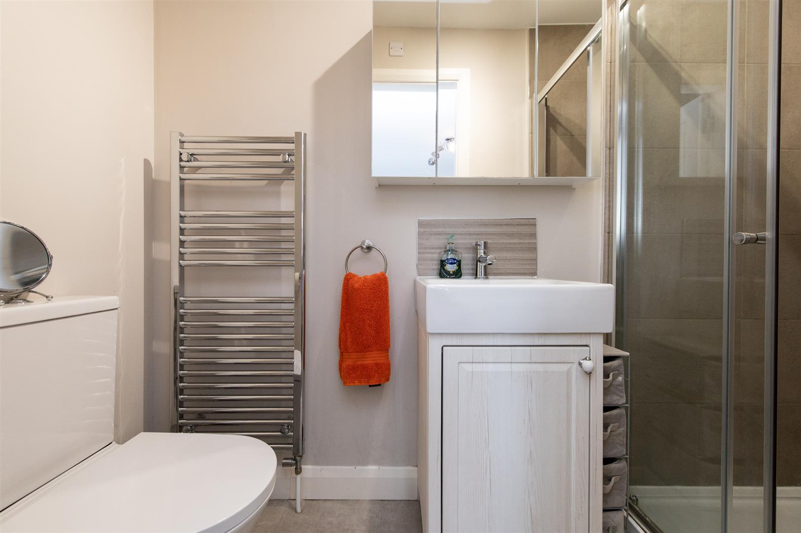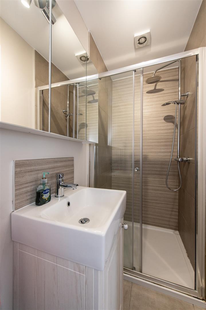 Low flush W/C, vanity unit with mixer tap, large shower room with rain shower attachment and hand shower, heated towel rail, ceramic tiled flooring, ceramic tiled flooring, tiling, extractor fan