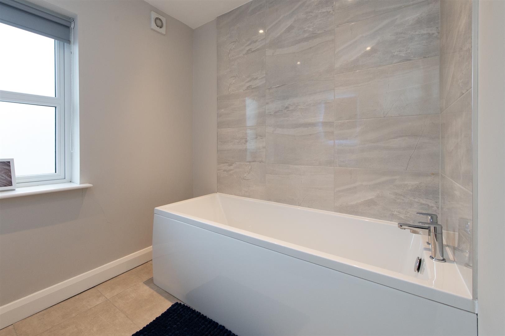 Modern white bathroom suite, low flush W/C, panelled bath with mixer tap, vanity unit with mixer tap, heated towel rail, tiling, ceramic tiled flooring, downlighters, extractor fan, ceramic tiled flooring