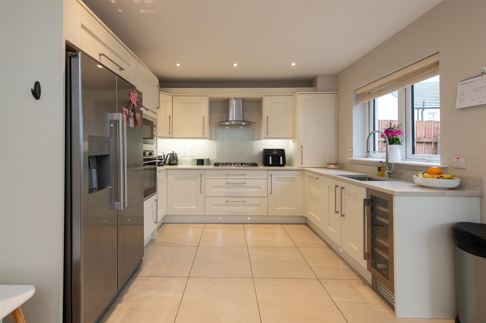 Modern fitted kitchen with range of high and low level units, quartz worksurfaces with upstands, inlaid stainless steel sink unit with mixer and quartz drainer, built in gas hob, built in microwave, built in fan assisted oven, built in dishwasher, space for fridge freezer, stainless steel extractor fan, ideal gas boiler, understairs storage with utility area, plumbed for washing machine, ceramic tiled flooring, downlighters, concealed lighting.