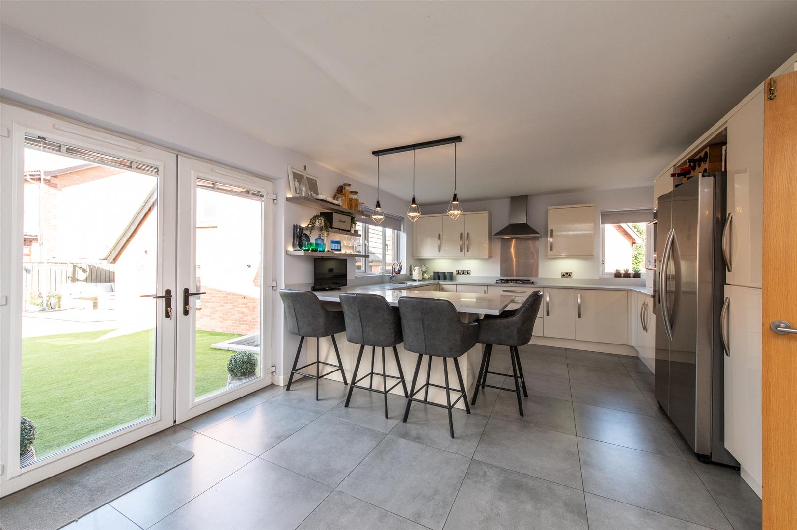 Modern fitted kitchen with range of high and low level units, Corian worksurfaces, stainless steel sink unit with Corian drainer, stainless steel gas hob, built in microwave oven, space for American fridge freezer, built in fan assisted oven, ceramic tiled flooring, breakfast bar.