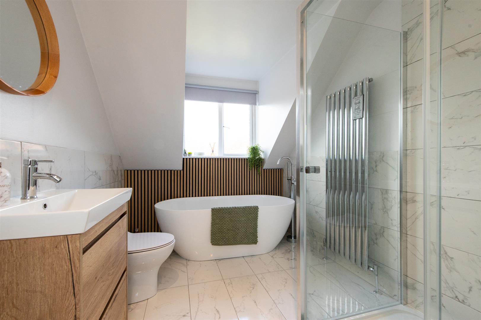 Low flush WC, vanity unit, glazed shower unit with controlled shower, heated towel rail