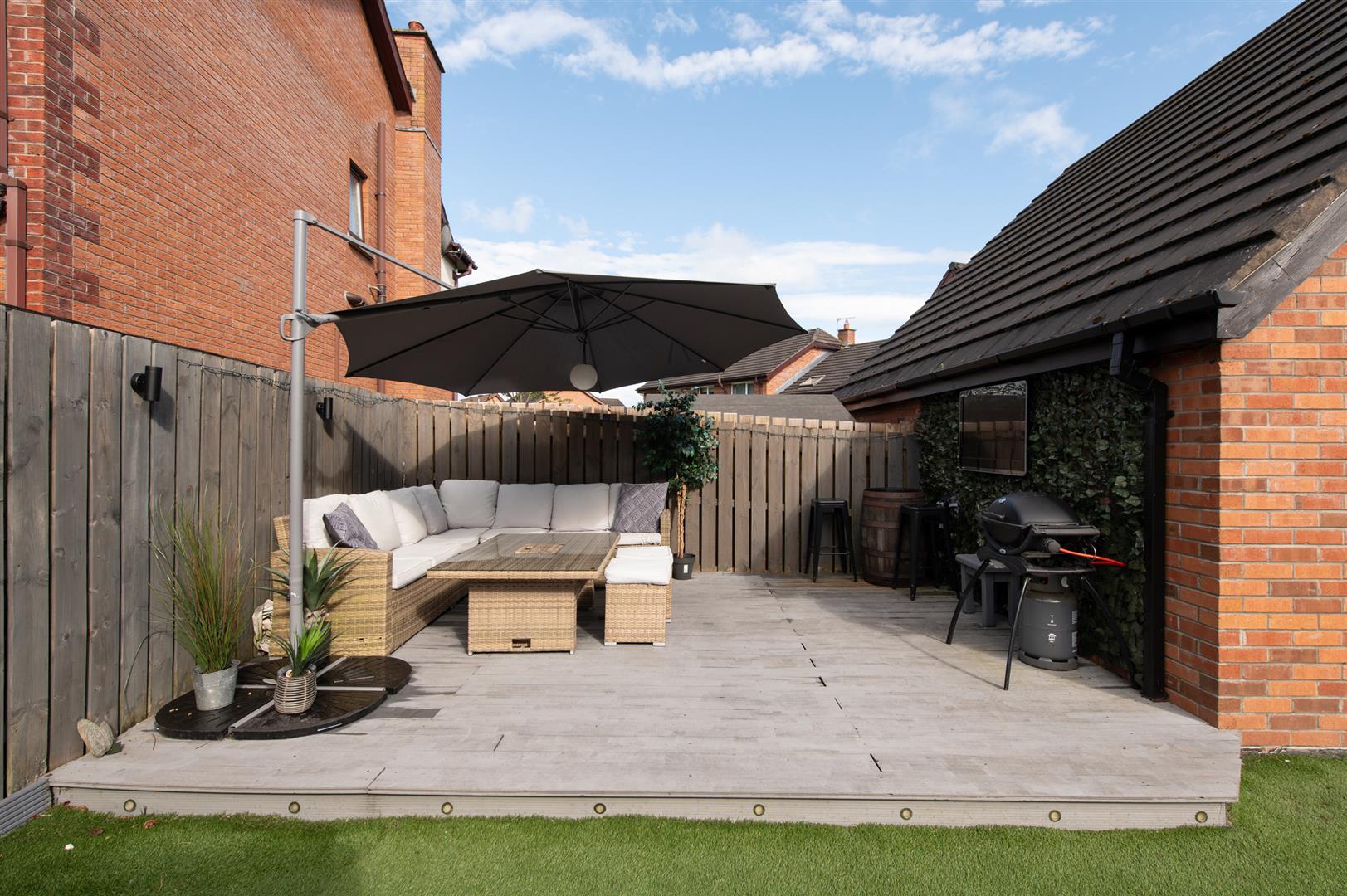 Rear in artificial grass, decked area