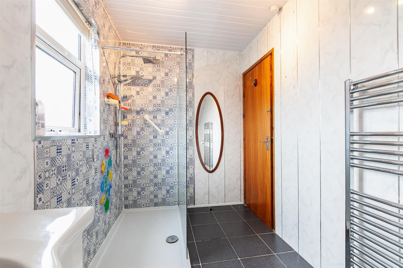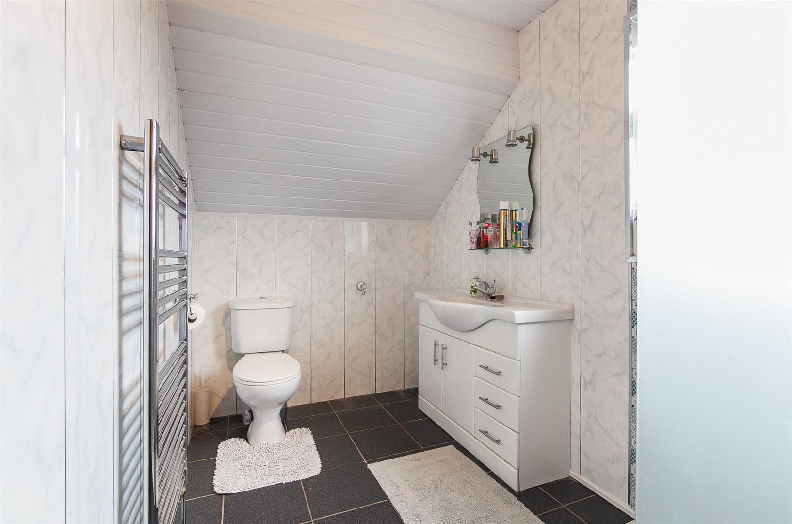 Contemporary, white, three piece suite comprising oversized shower enclosure, vanity unit and WC. Thermostat controlled mains shower unit with drench shower head. Fully panelled walls. Chrome towel radiator. Tiled floor.