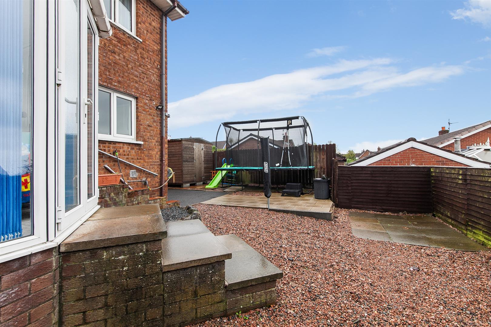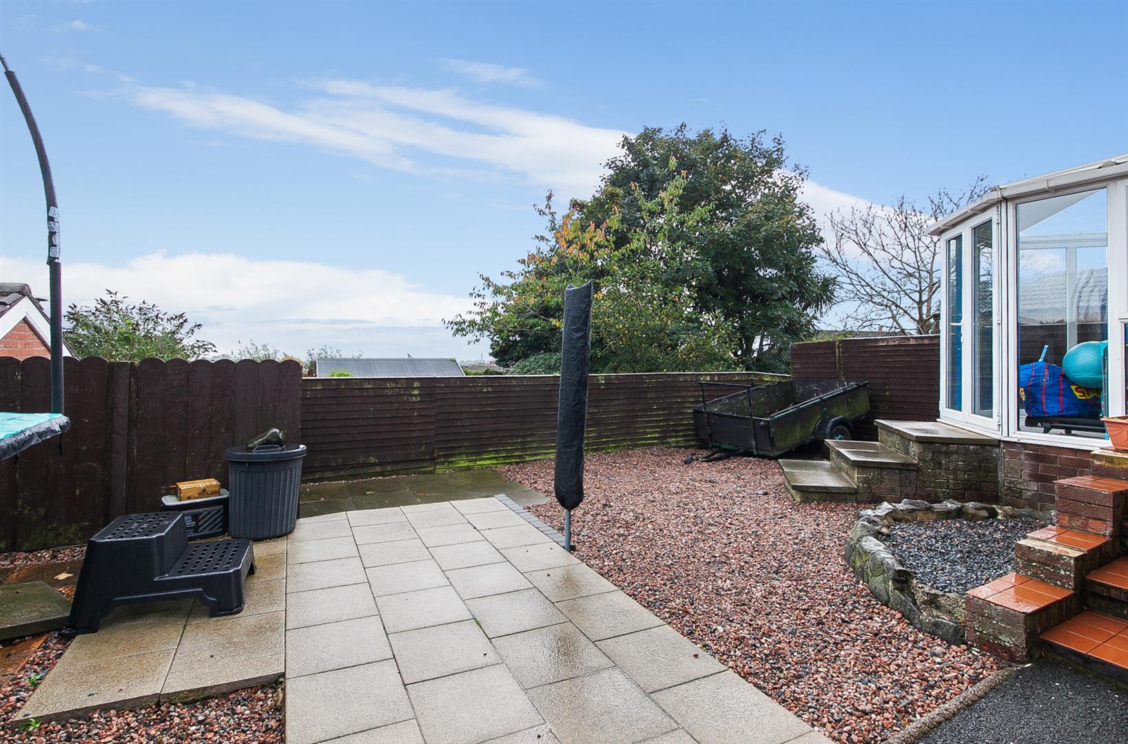 Fully enclosed rear garden finished in paved patio areas, decorative stone and tarmac.