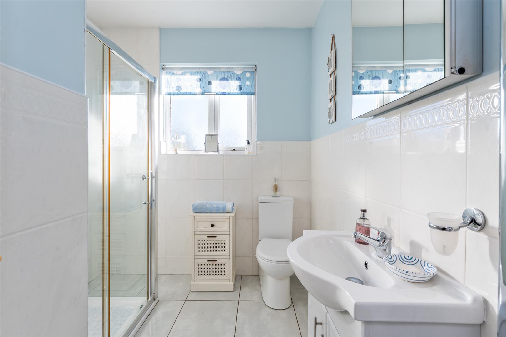 Contemporary, white, three piece suite comprising oversized shower enclosure, vanity unit and WC. Electric shower. Chrome towel radiator. Half tiling to walls. Tiled floor.