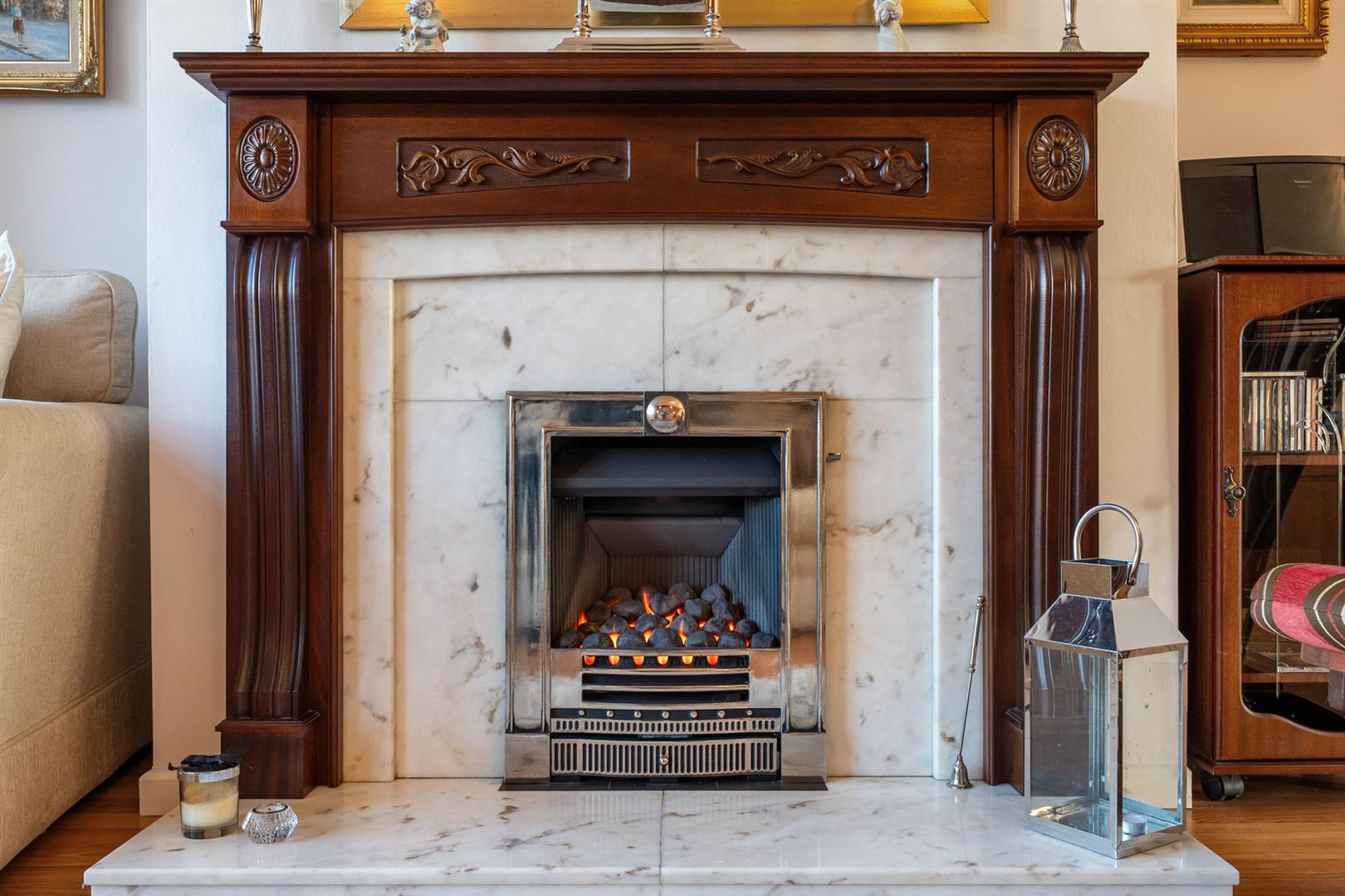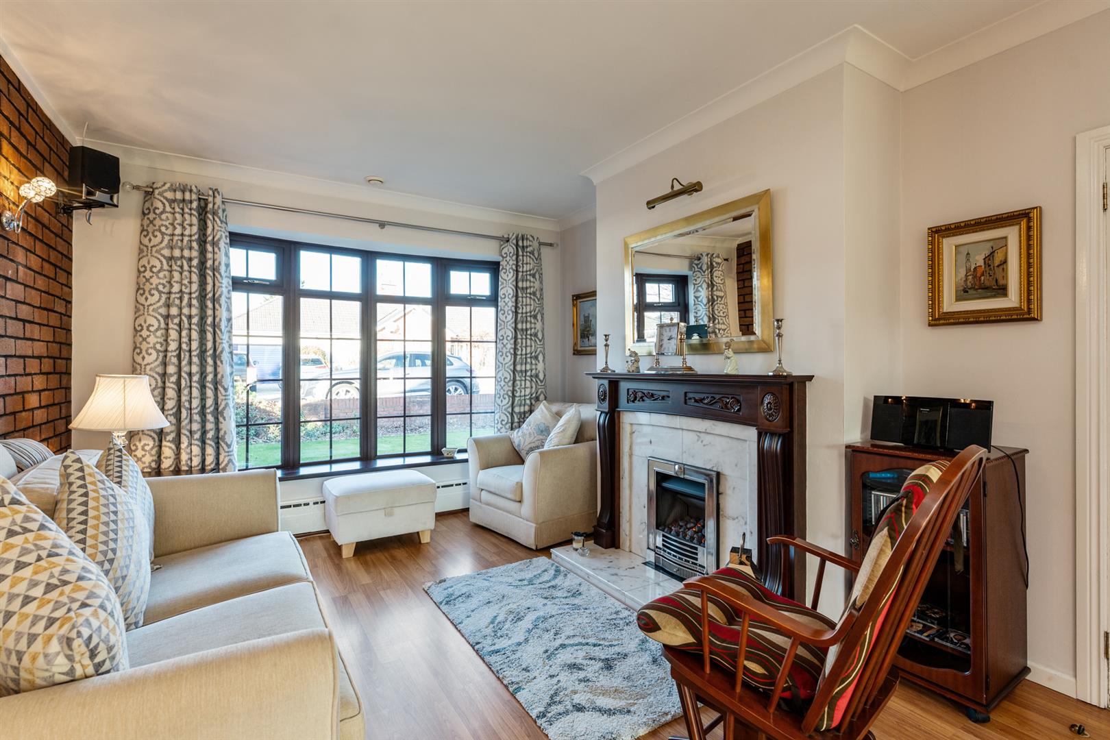 Gas fire in marble fireplace with matching hearth and carved mahogany surround. Bay window to front elevation. Wood laminate floor covering. Access to utility room and integral garage. Aluminium framed double glazed sliding patio door leading to: