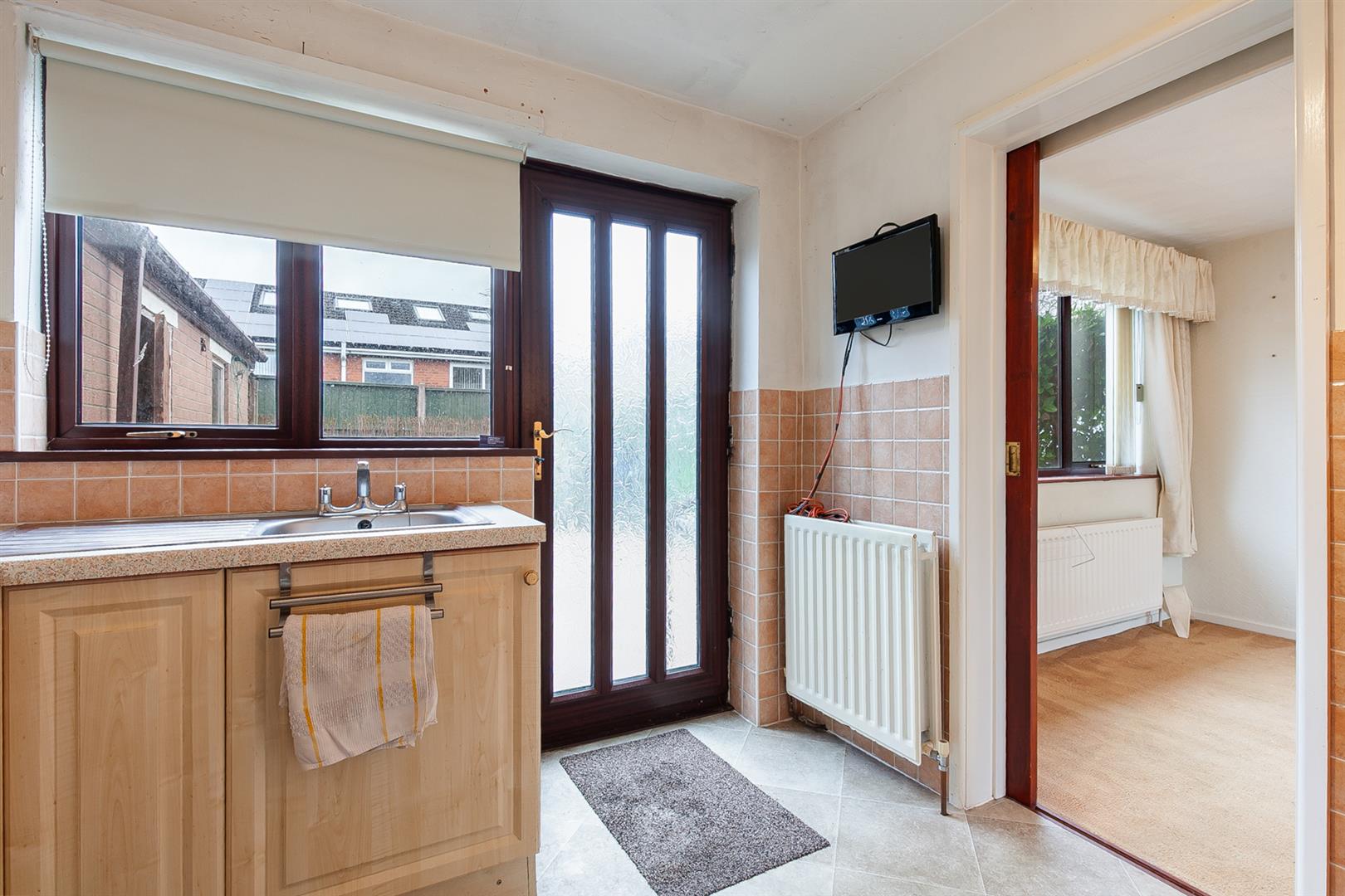 Modern fitted kitchen with range of high and low level storage units with contrasting granite effect melamine work surface. Stainless steel sink unit with draining bay. Integrated ceramic hob with extractor hood over. Integrated double oven. Plumbed and space for washing machine. Splashback tiling to walls. PVC double glazed door leading to rear garden.