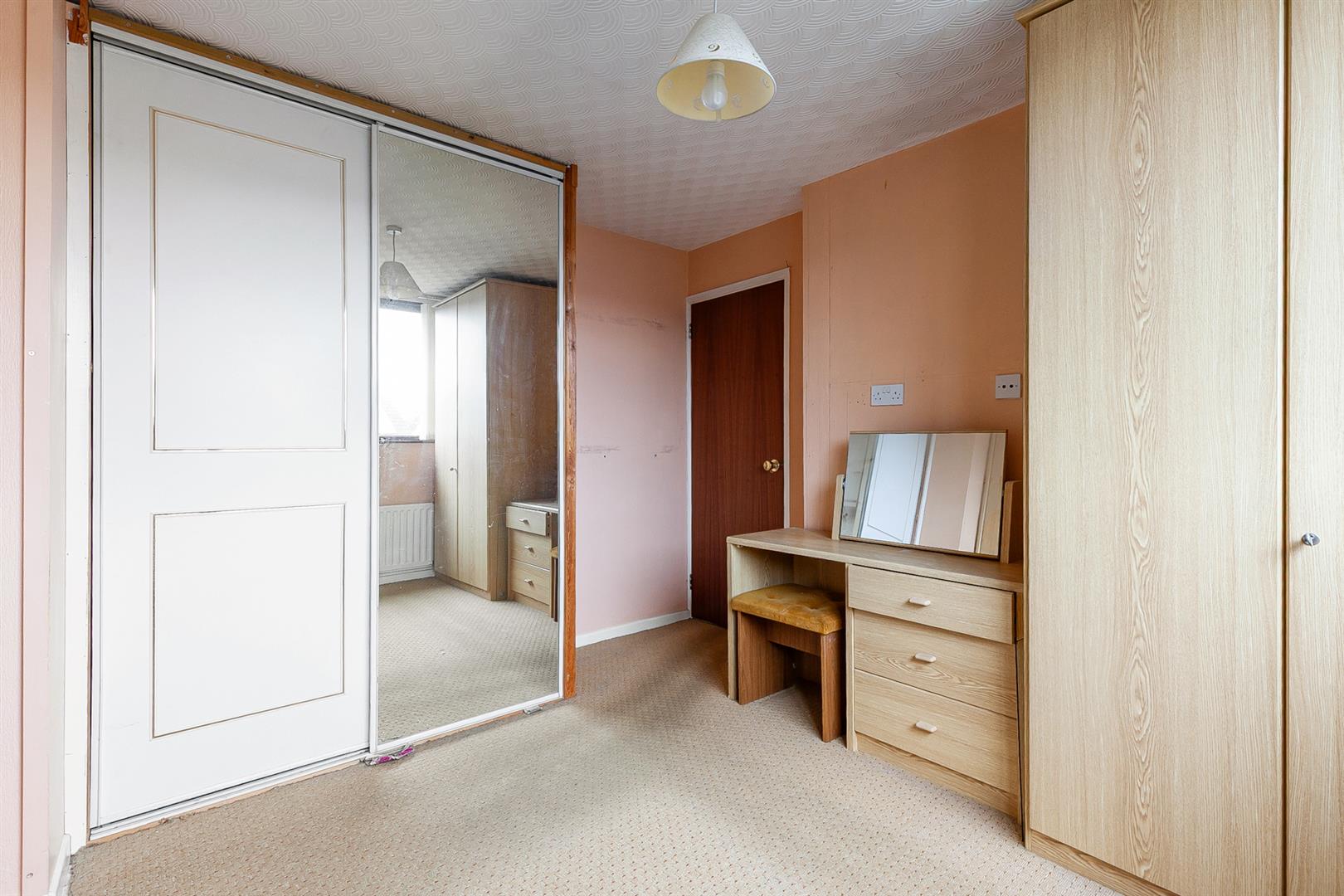 Fitted wardrobe in mirror panelled sliding door.