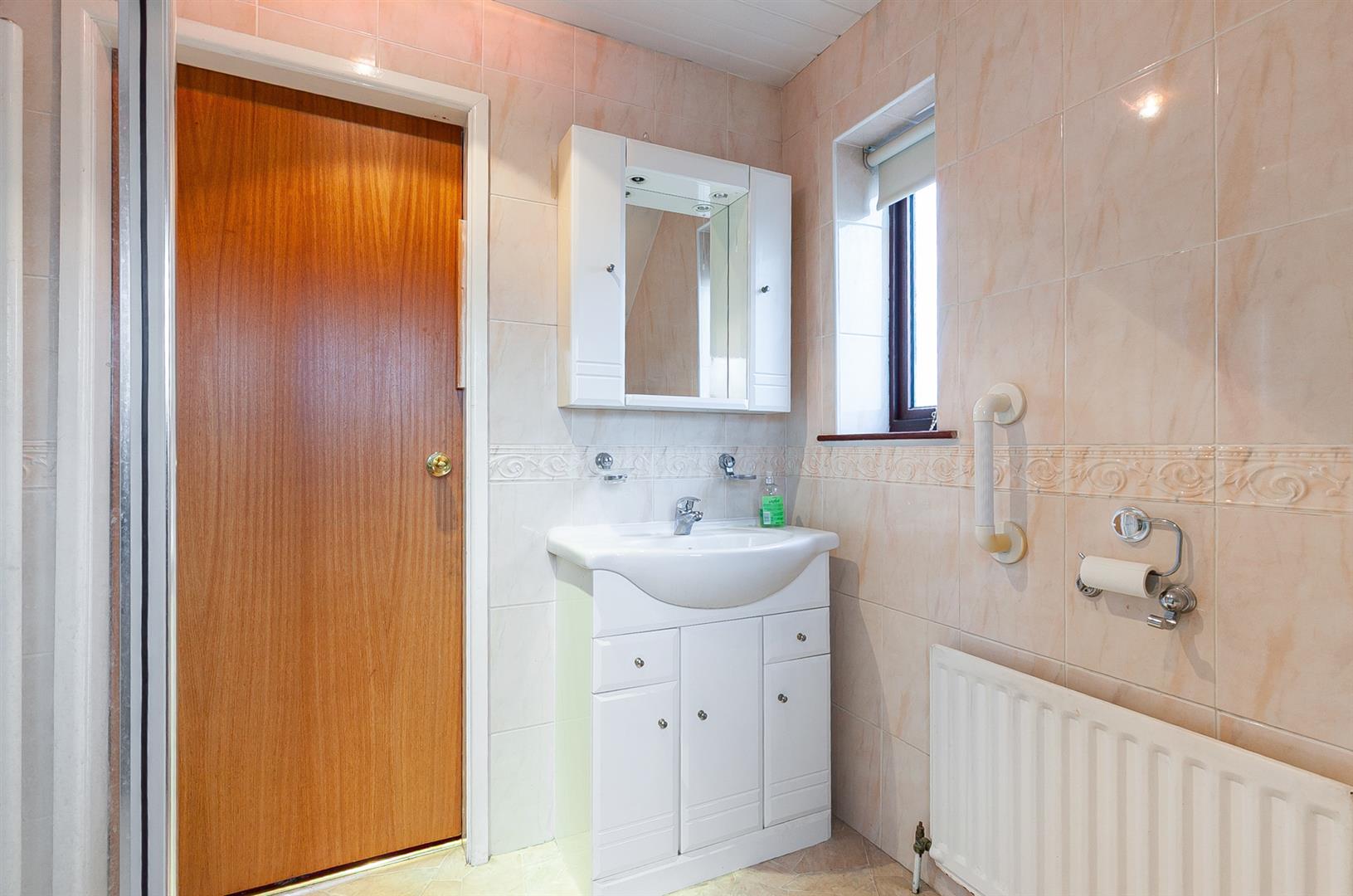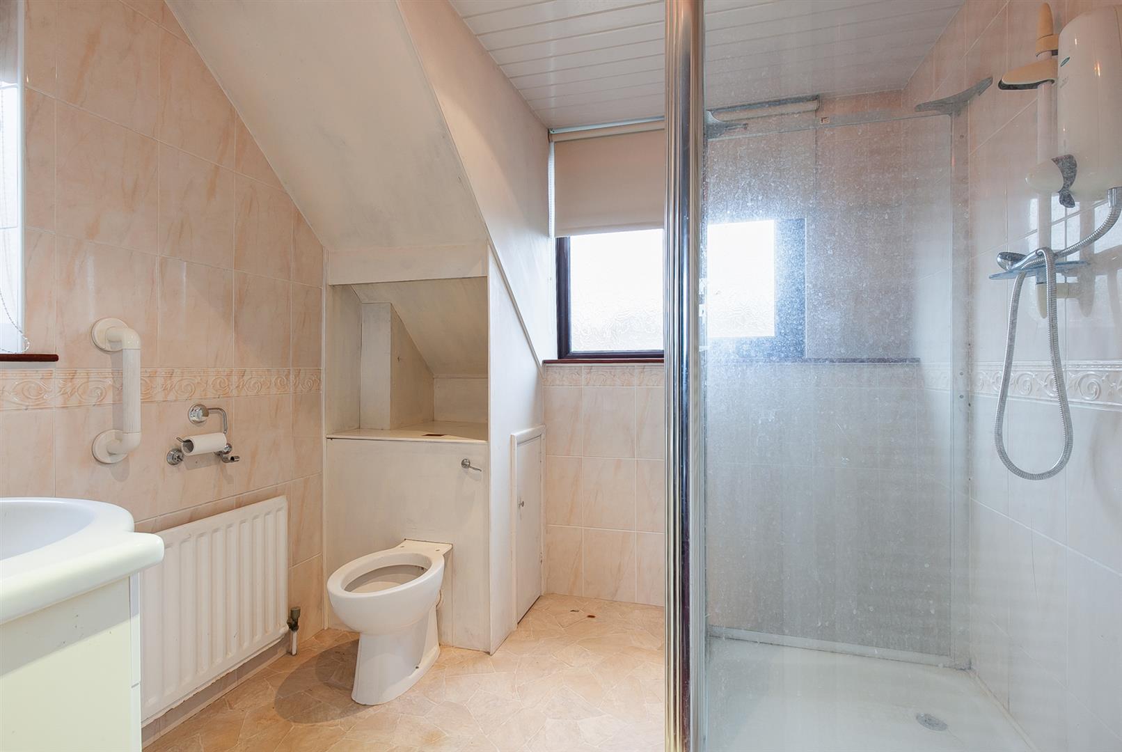 White, three piece suite comprising shower enclosure, vanity unit and concealed cistern WC. Electric shower. Towel radiator. Fully tiled walls.