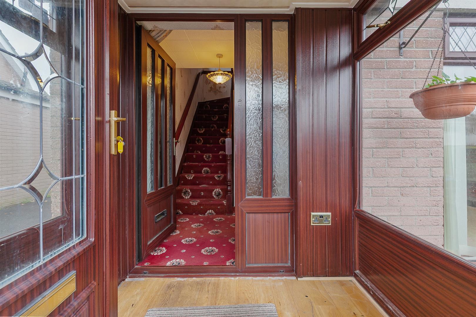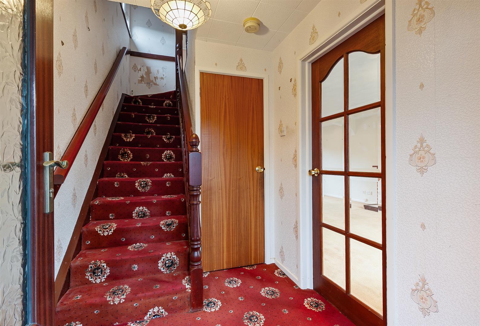 Stairwell to first floor. Access to under stairs store. Glass panelled door leading to: